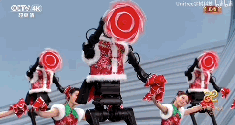 宇树的下一个高光时刻,出现在春晚的舞台上。一群人形机器人 Unitree H1,和真人舞蹈演员一起,来了一场人机共舞的扭秧歌大赛。