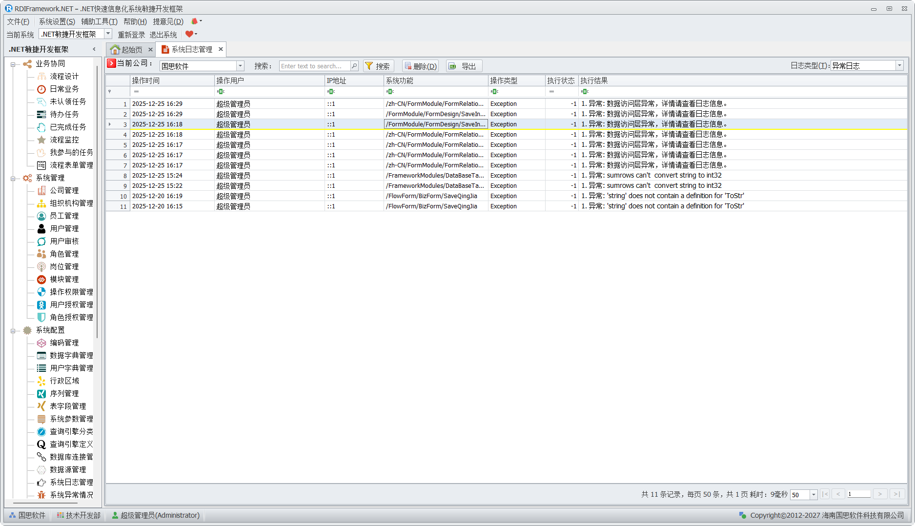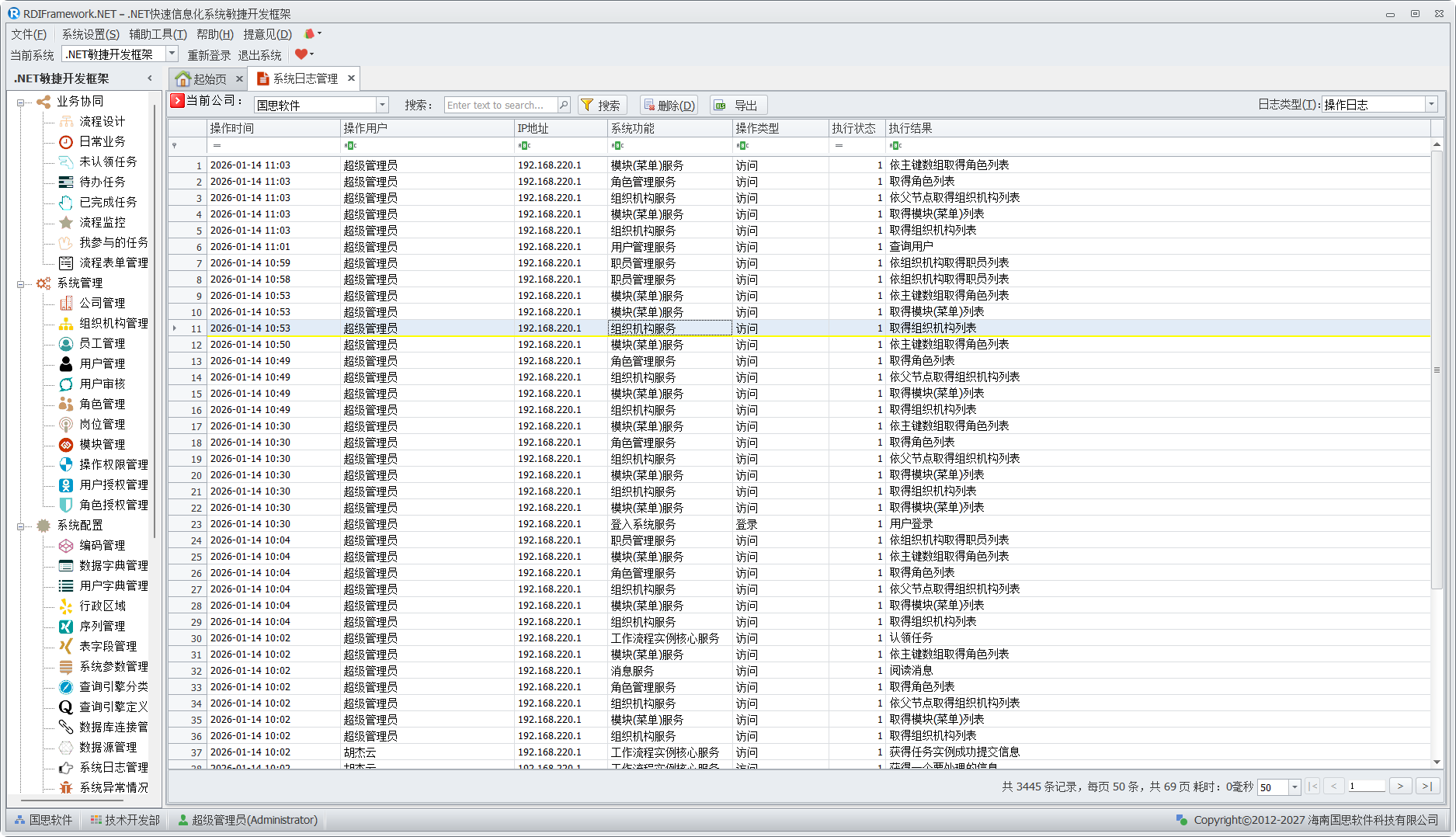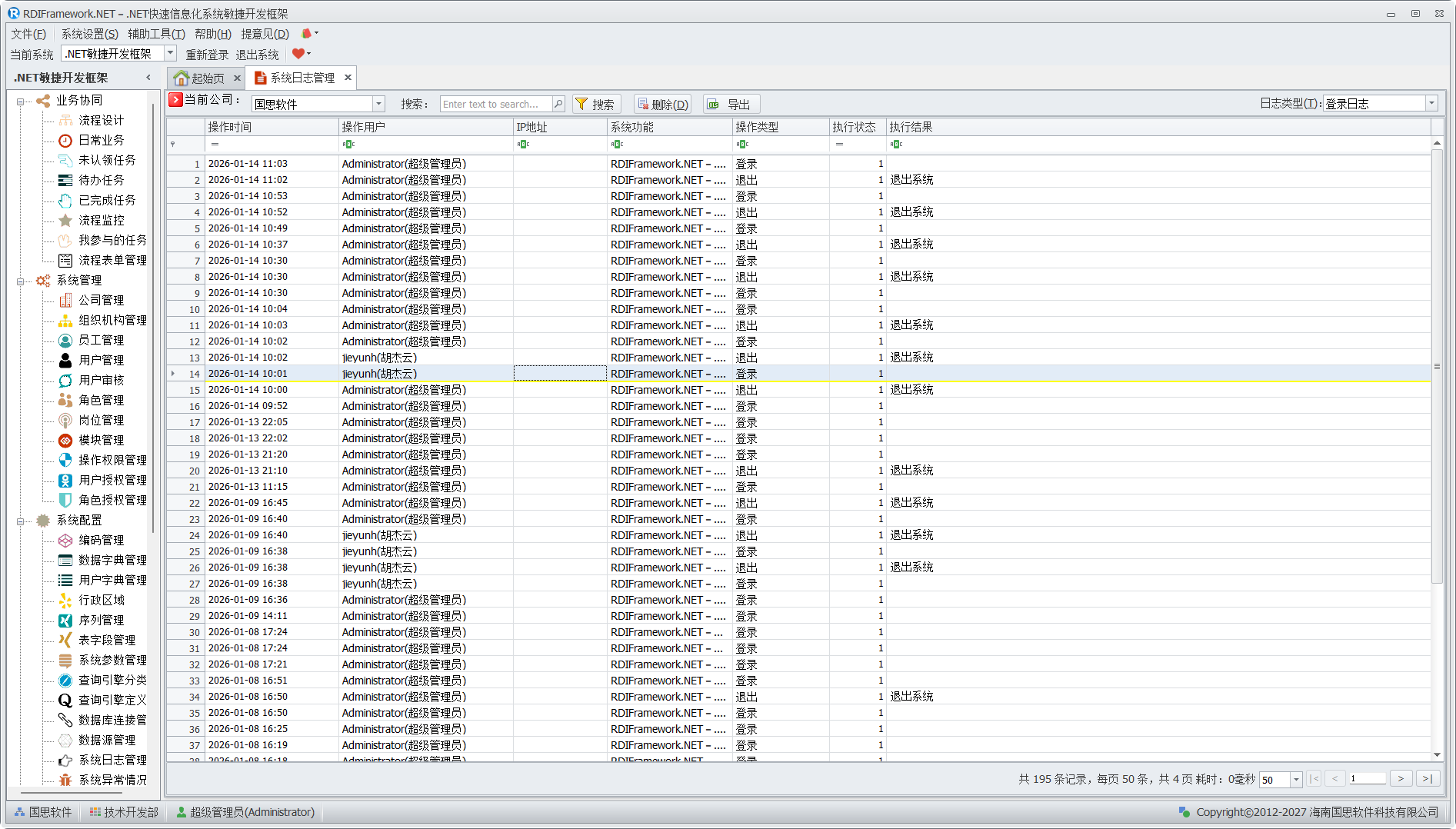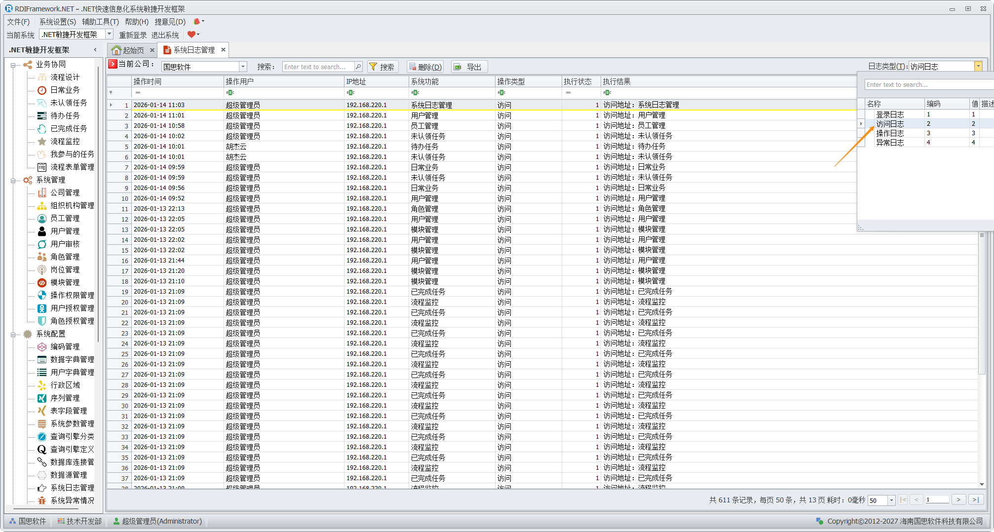 框架日志管理对于框架的安全审查有着重要的地位,用户的登入登出情况,模块的访问情况,服务调用情况,功能操作情况等都应该记录下来,也方便管理人员查看了解整个系统的使用情况,让异常使用问题即使得到处理。框架日志管理按日志类型分为:登录日志、操作日志、访问日志、异常日志。 登录日志如下图所示。