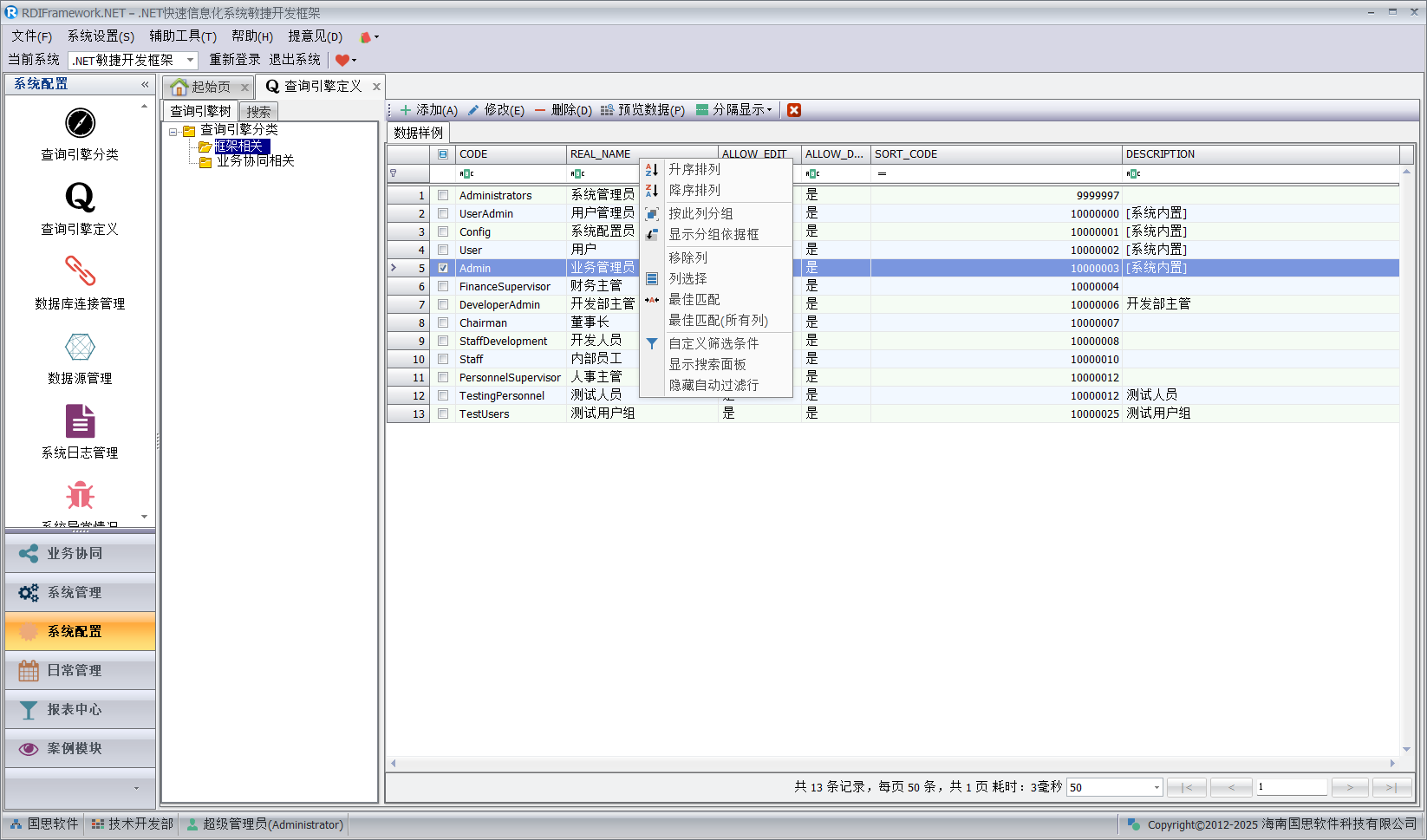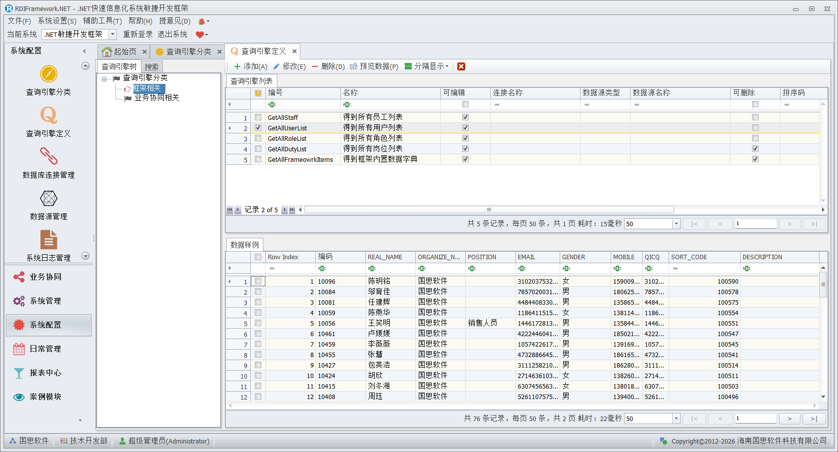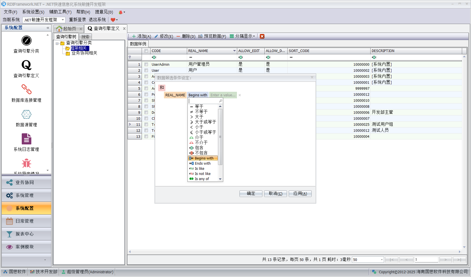 在查询引擎分类(分类)的基础上,我们可以按引擎分类定义查询,供用户使用。查询引擎是根据定义输出查询结果,大大较少代码量,提高开发速度,可用于业务报表数据的数据源等。查询引擎定义如下图所示。窗口左侧显示的是查询引擎分类中定义的分类,右侧是选择指定分类我们做的查询引擎定义。