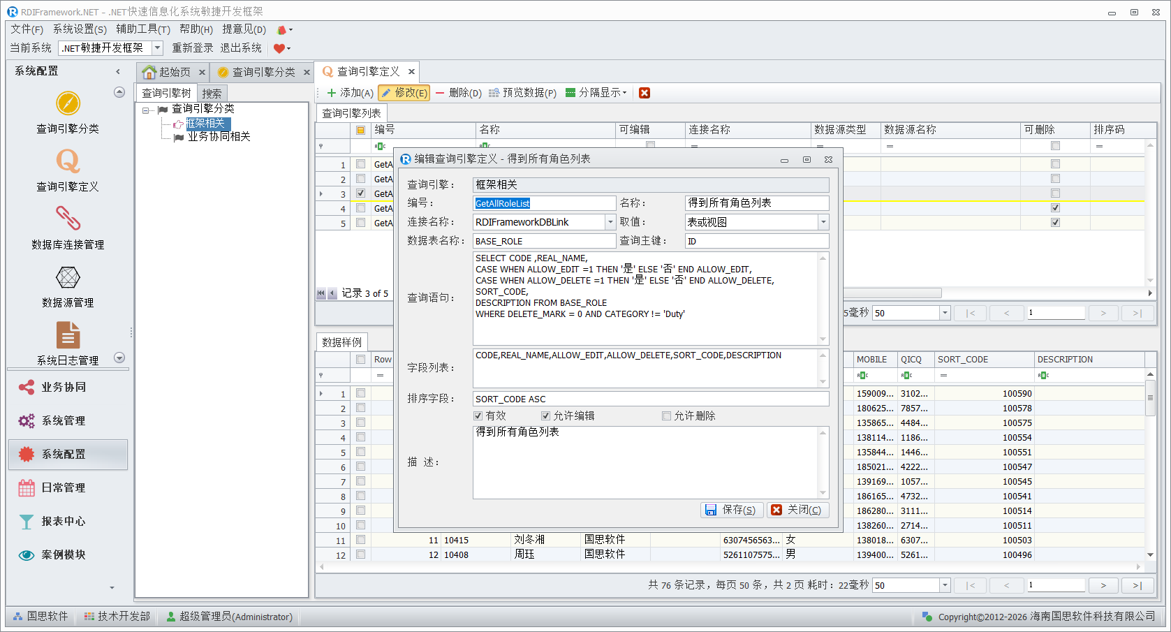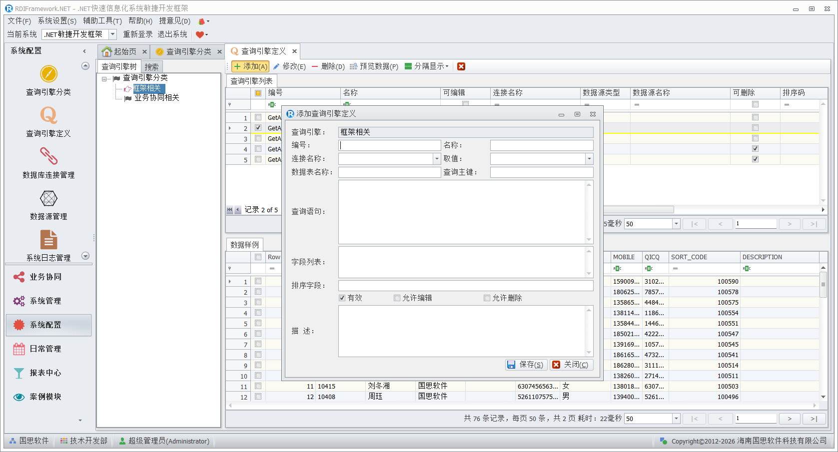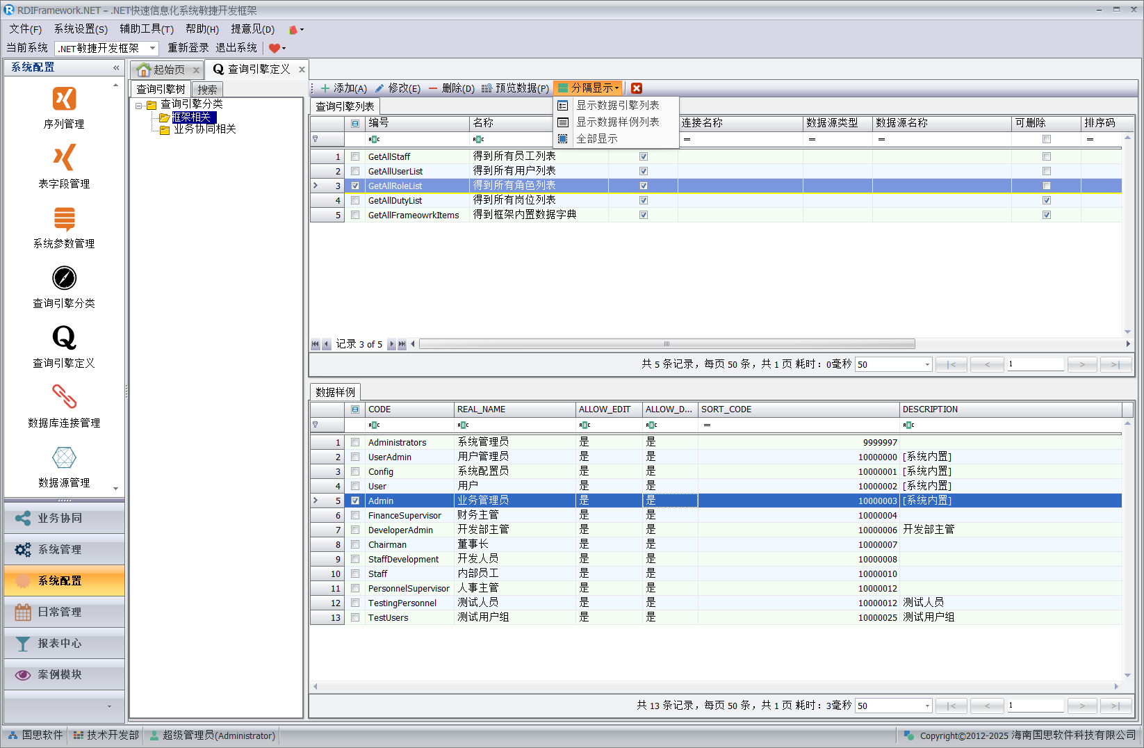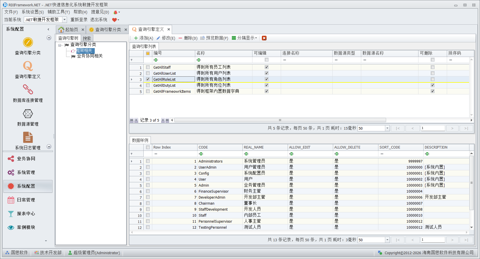 在查询引擎分类(分类)的基础上,我们可以按引擎分类定义查询,供用户使用。查询引擎是根据定义输出查询结果,大大较少代码量,提高开发速度,可用于业务报表数据的数据源等。查询引擎定义如下图所示。窗口左侧显示的是查询引擎分类中定义的分类,右侧是选择指定分类我们做的查询引擎定义。