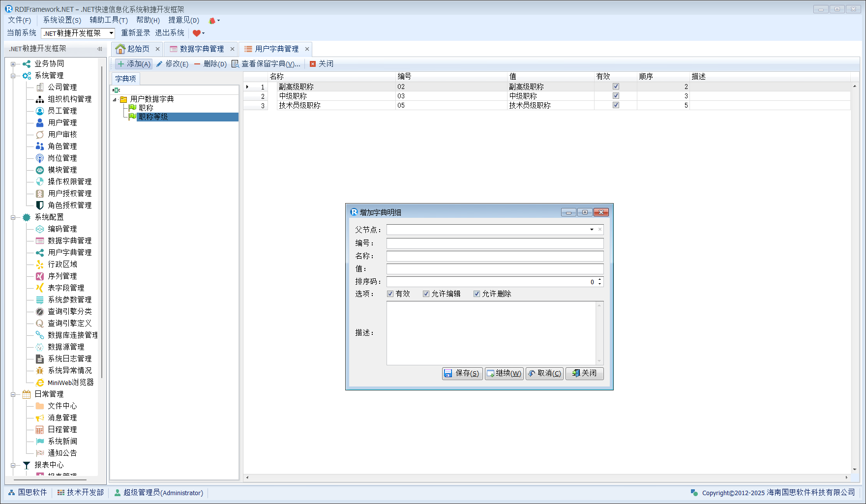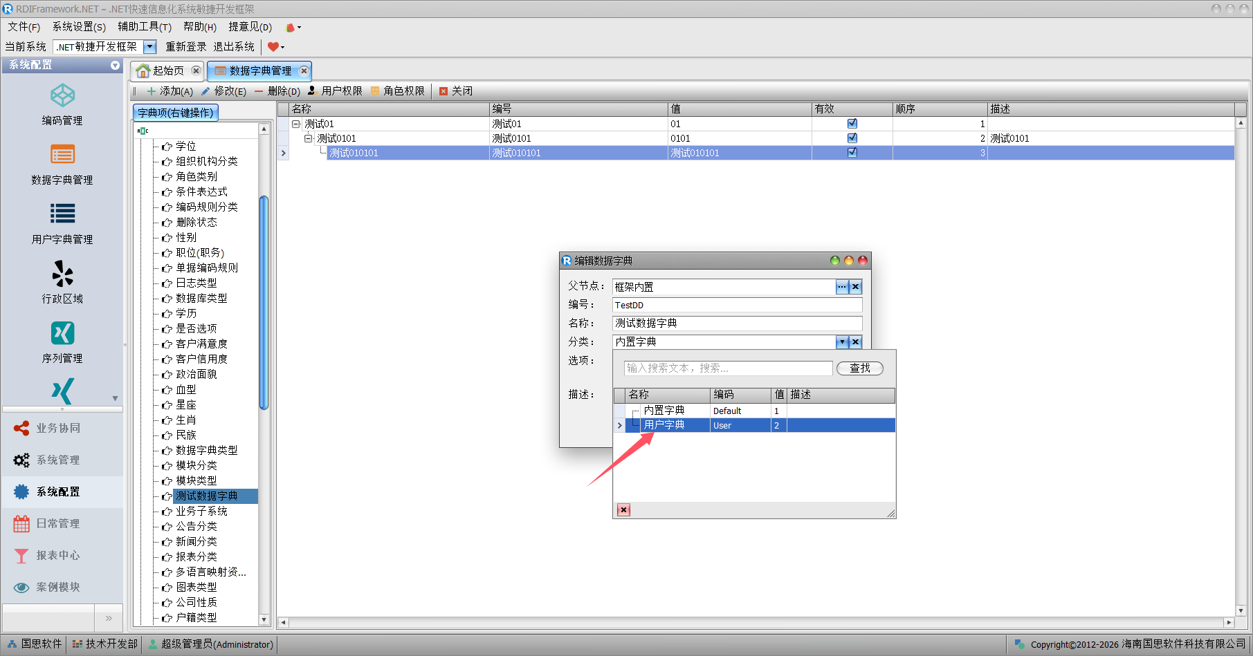 在数据字典管理中,字典项的分类有内置字典与用户字典,默认增加的内置字典。如果某个字典项需要用户扩展定义,如:职称等级,每个公司可能就会不一样,这个职称等级类型就可以定义为用户字典,让客户自己去增加字典明细,这在 SaaS 应用中是非常常用的功能。