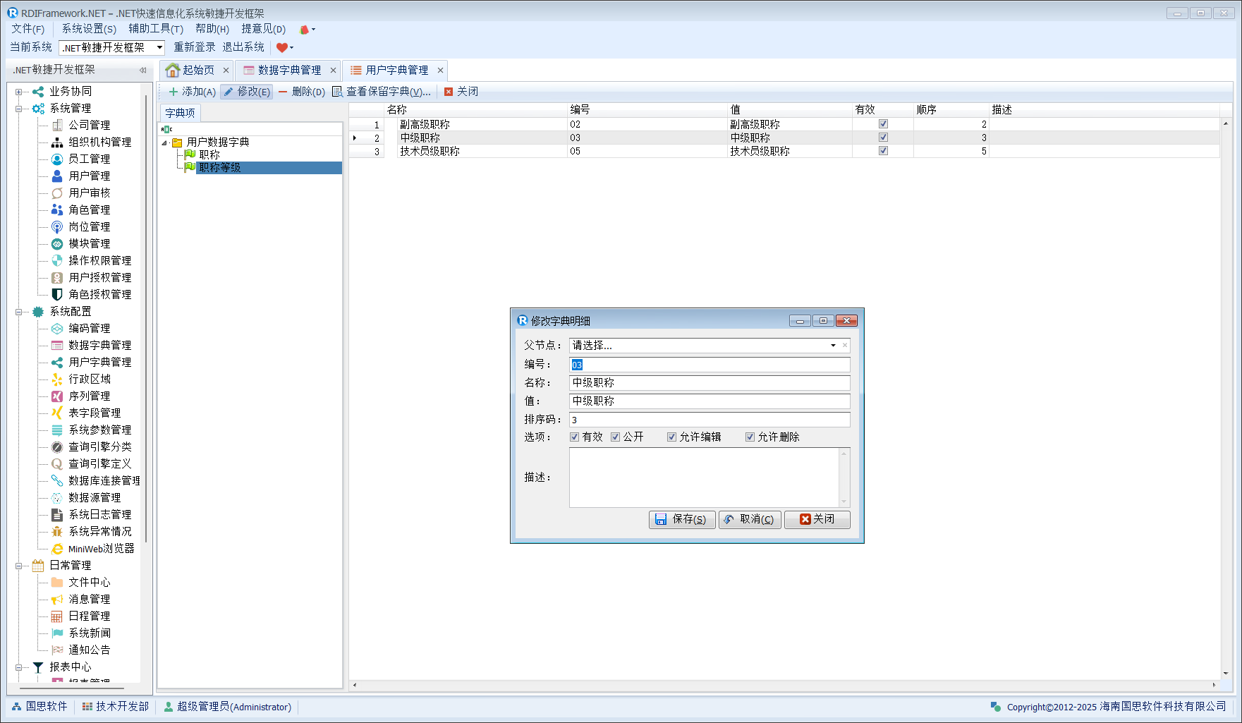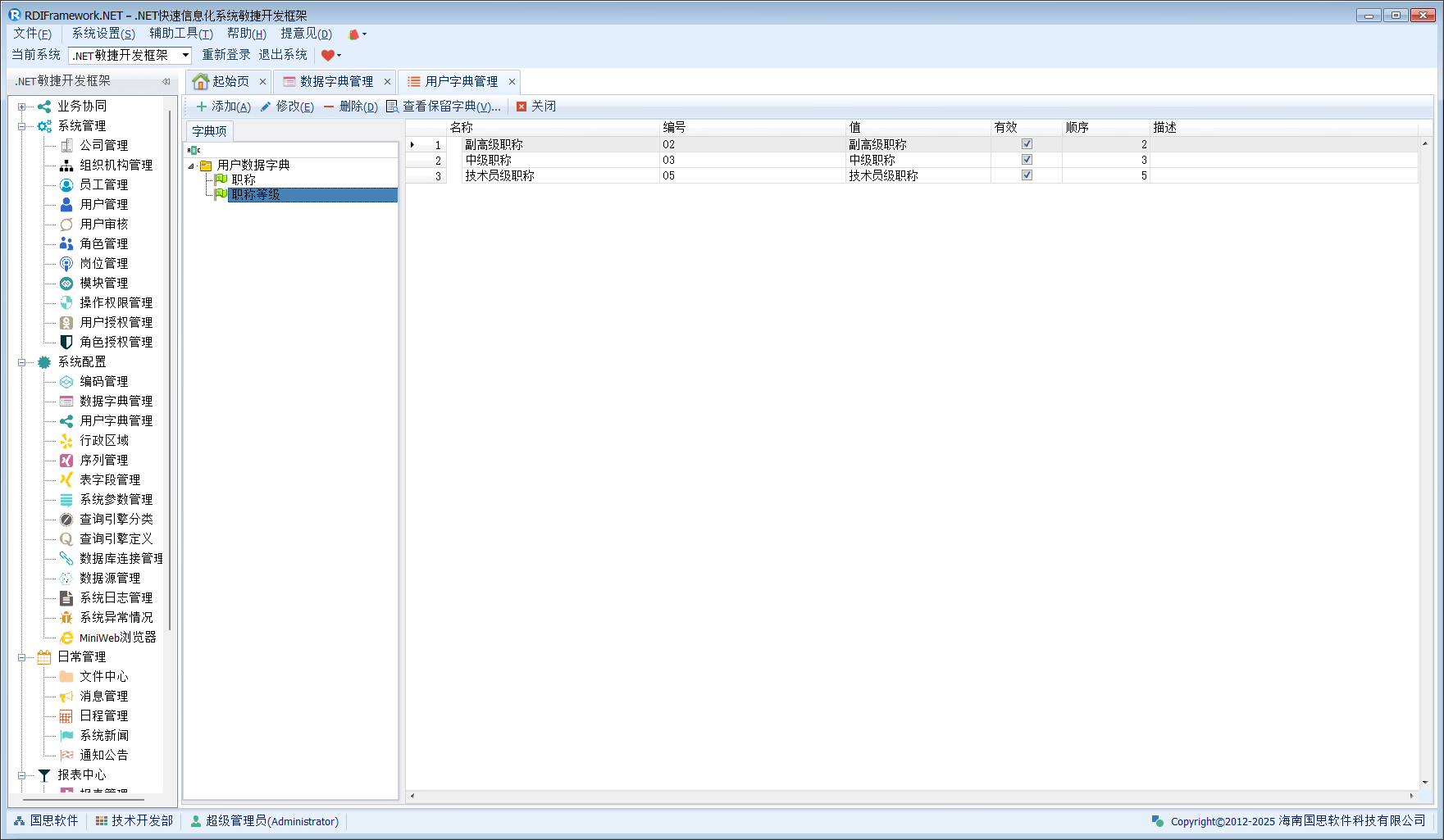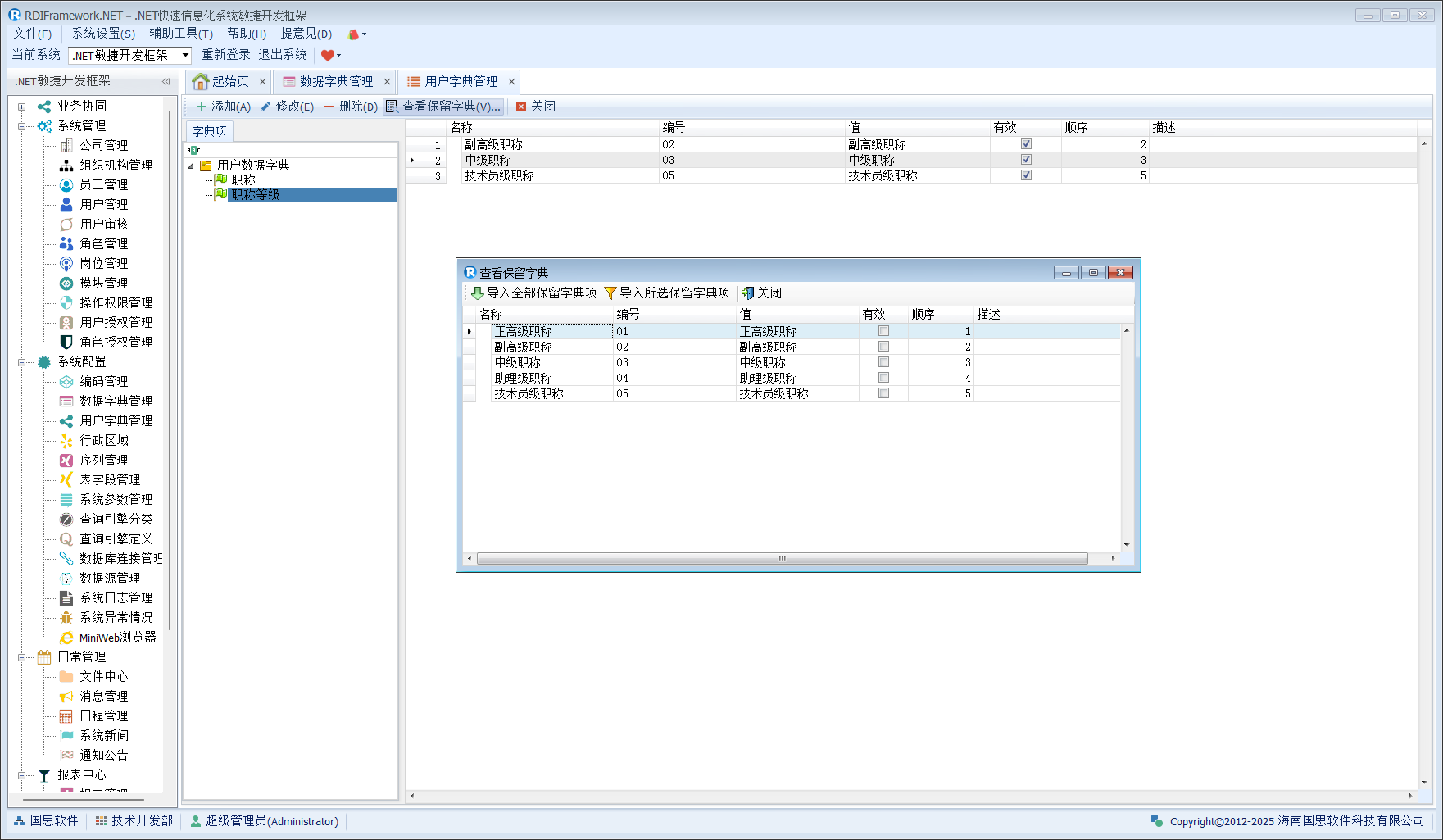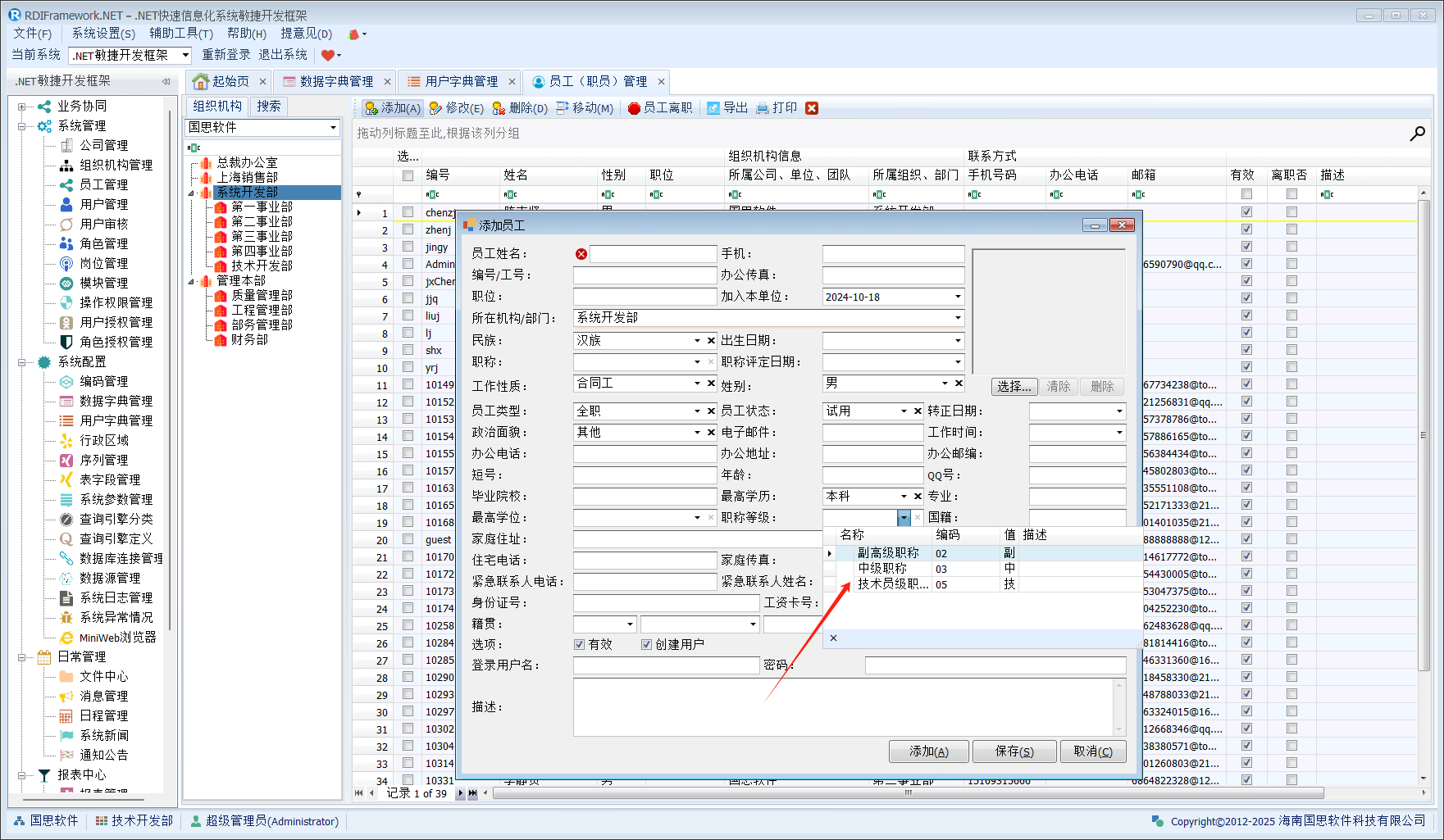 在查看保留字典界面,为了加快操作人员的录入,可以全部或部分导入系统保留字典明细项。在上图中,我们设置了自己的职称等级明细项,在应用的地方可以查看设置的效果,如下图所示。