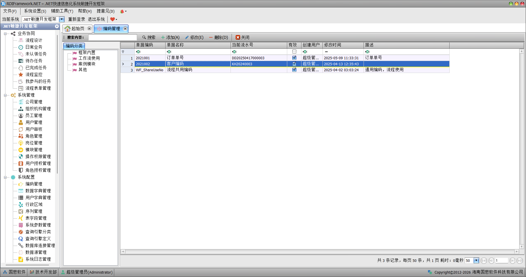 每一个企业应用中不可避免的都会涉及到业务编码规则的问题,比如订单管理系统中的订单编号,比如商品管理系统中的商品编码,比如项目管理系统中的项目编码等等,这一系列的编码都需要管理起来,那么它们的应该如何编码的,具体的编码规则我们很多时候都是直接写在程序当中。一套灵活、实用的编码规则是非常的重要,我们框架已经支持了对单据编码的处理,编码管理如下图所示。