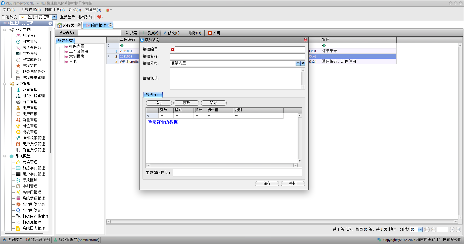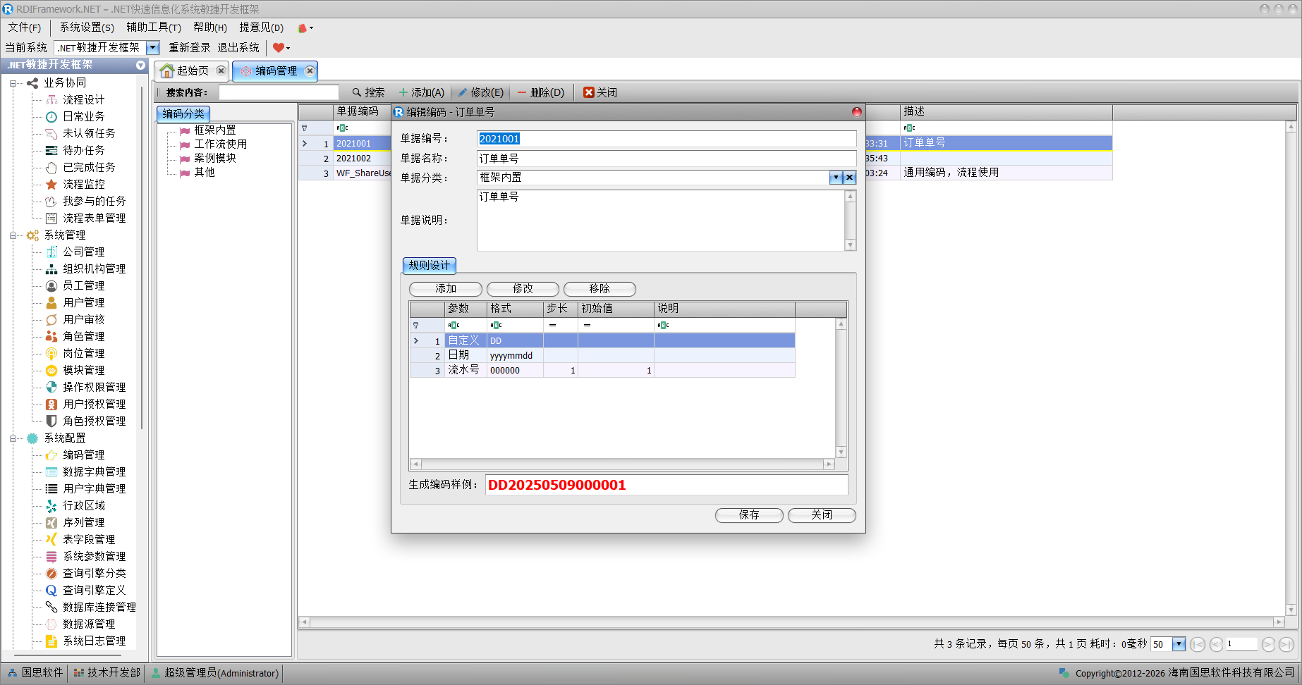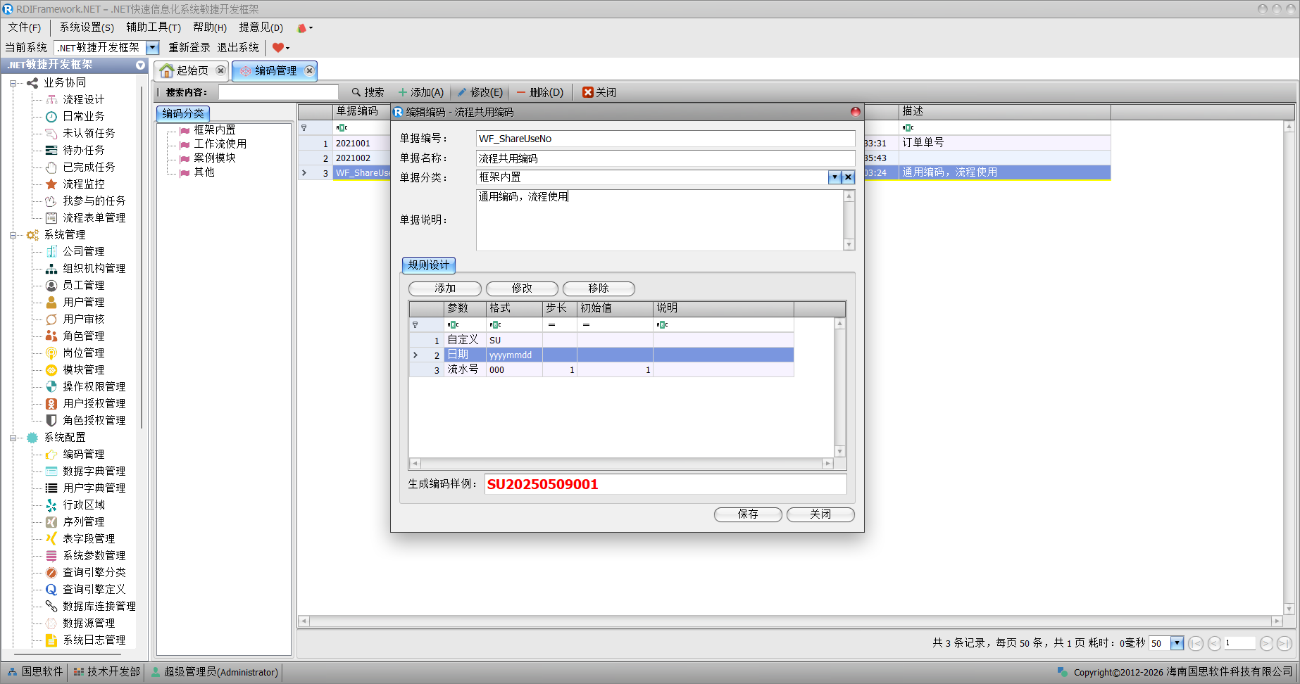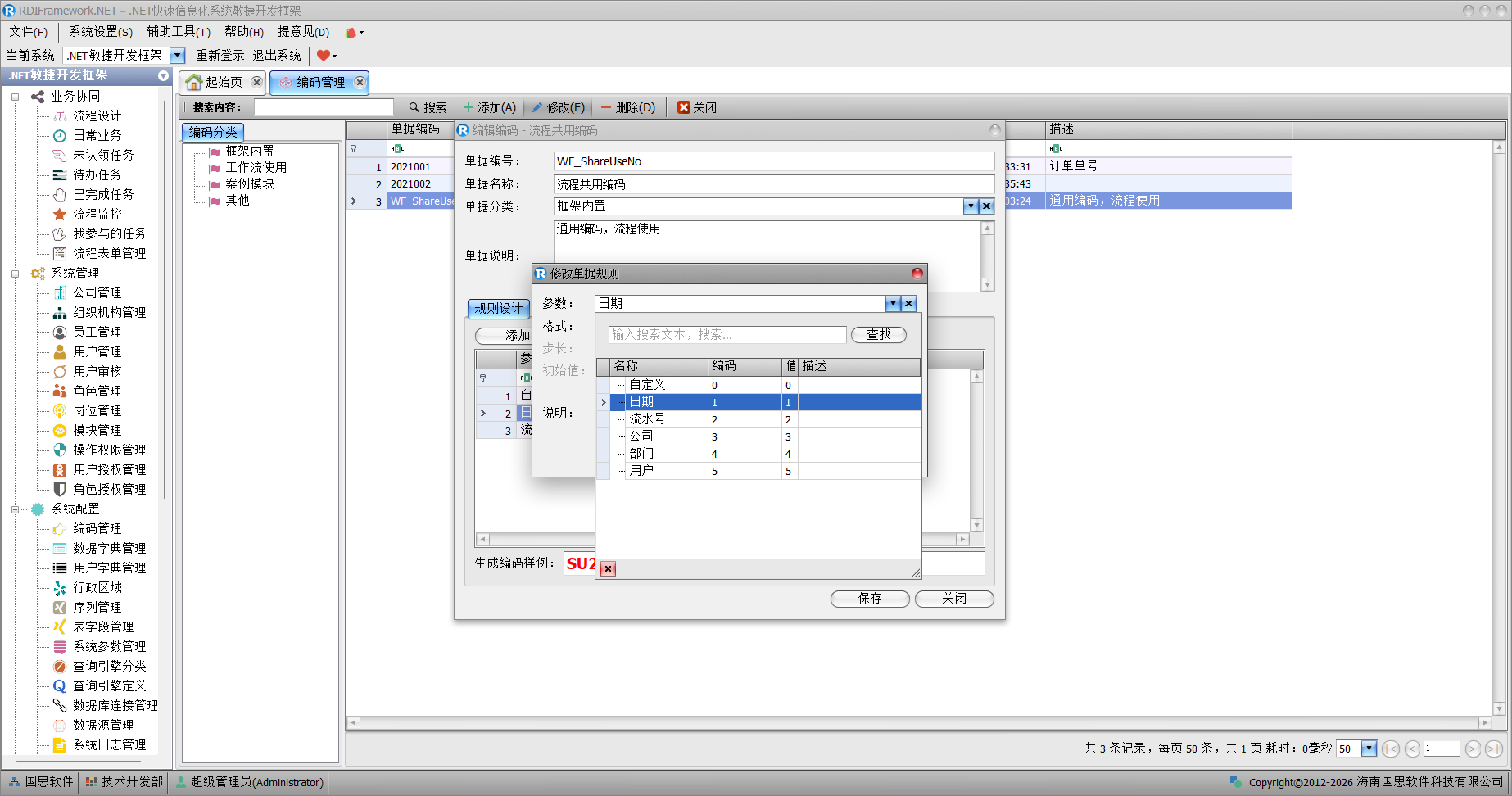 我们可以自定义、按日期、以流水号、以公司、部门、用户的编号进行组合制定编码的规则。
