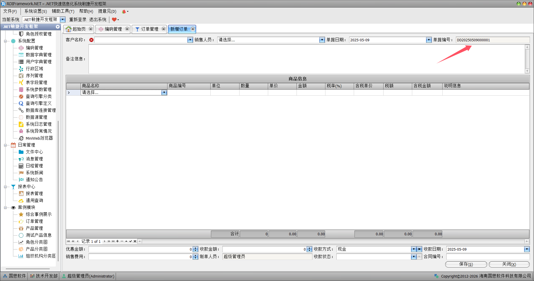 在订单管理中,订单的编号我们使用了单据编码进行统一生成处理,如下图所示。