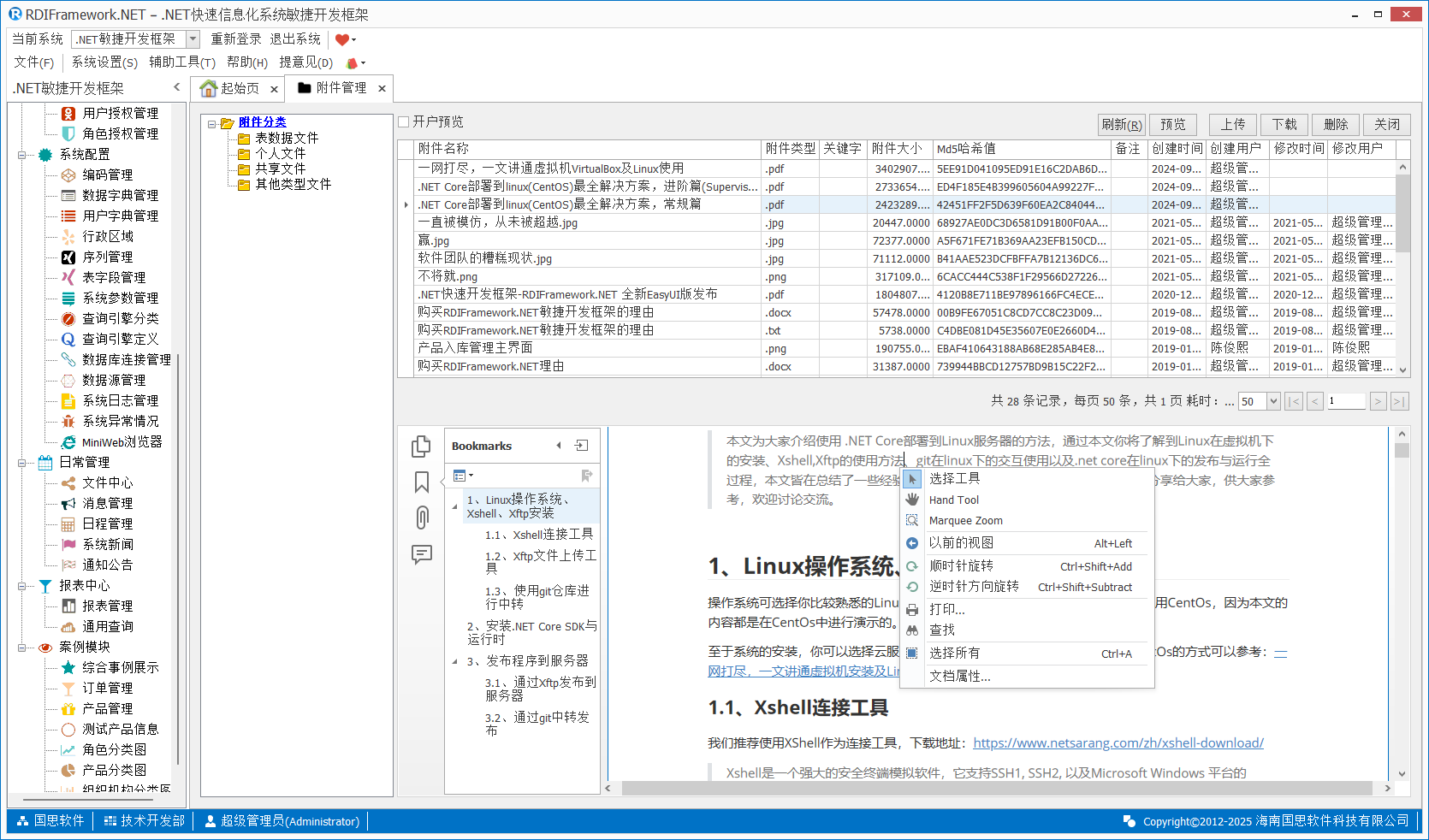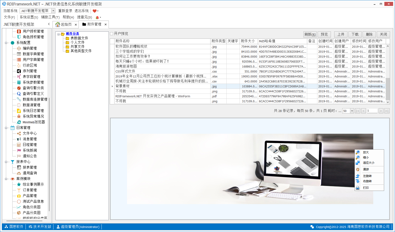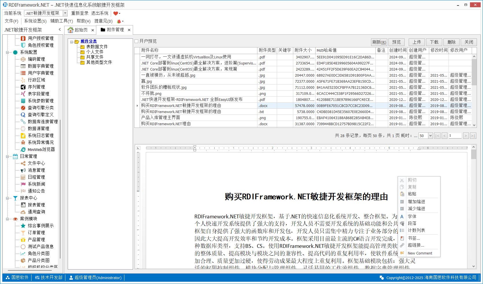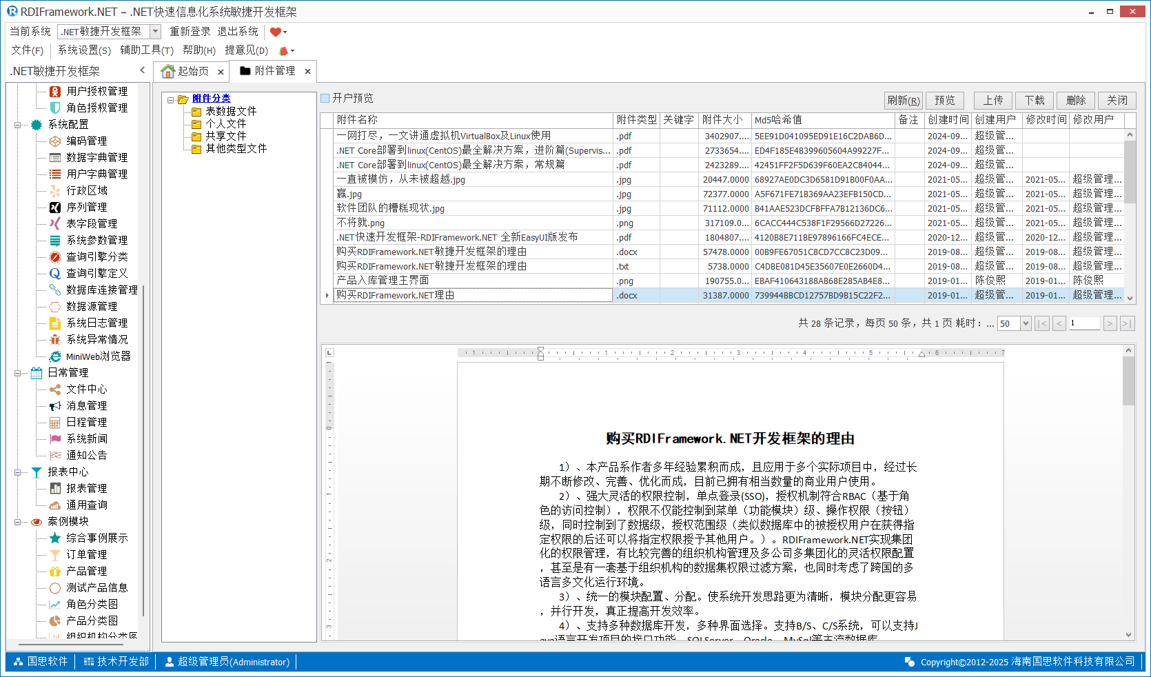 左侧选择对应文件分类后,右侧会展示对应的文件,根据需要我们可以上传文件,删除、下载文件、在线预览上传的文件等。注意左侧的附件分类有一个特殊的分类叫"表数据文件",这个是我们通过我们的一个"通用附件"控件针对特定表进行上传的文件。这儿只展示了我们自己上传的文件,非常的实用。