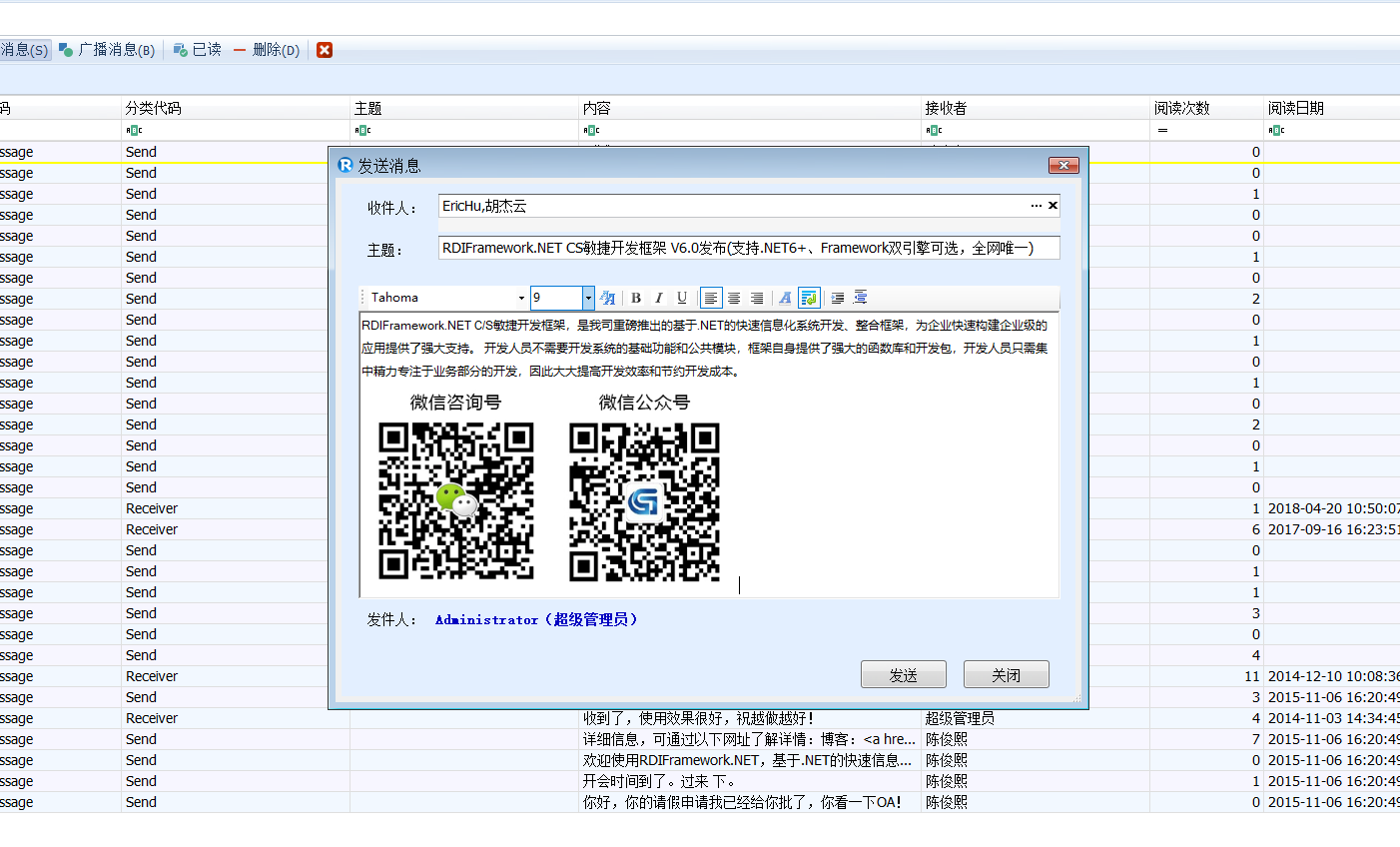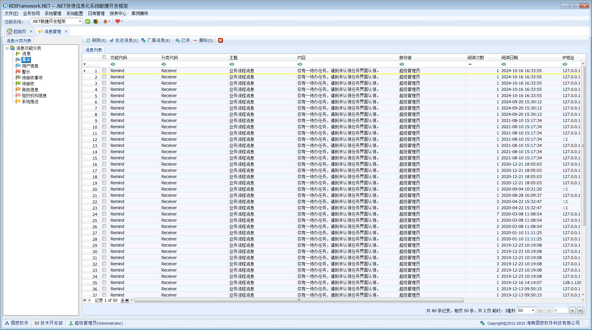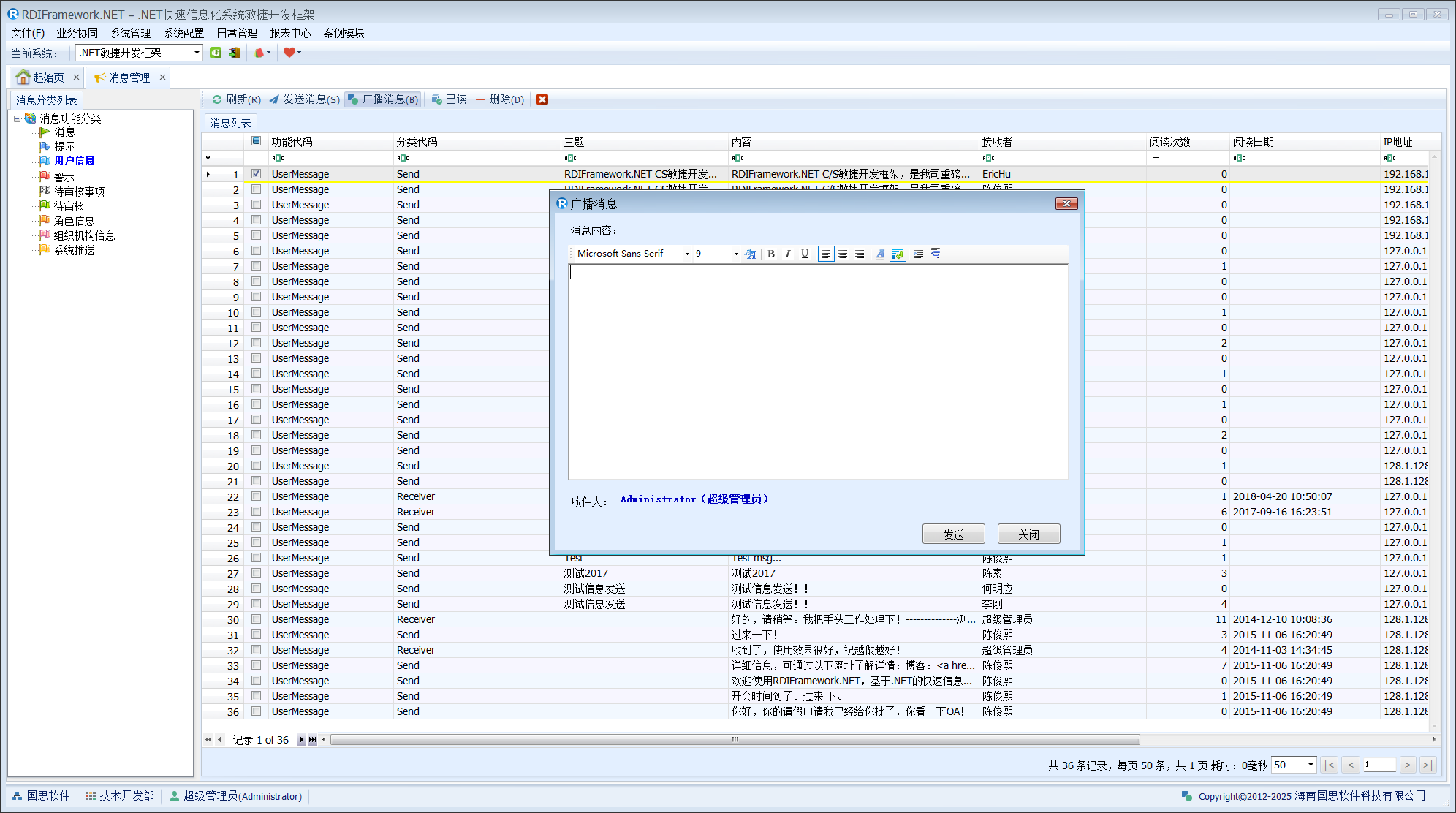 "消息管理"模块是对框架的所有消息进行管理,"消息管理"主界面如下图所示。通过左侧的消息分类,可以查看所选分类的所有消息列表。在主界面上我们还可以发送消息、广播消息、标记消息为已读以及删除指定消息。
