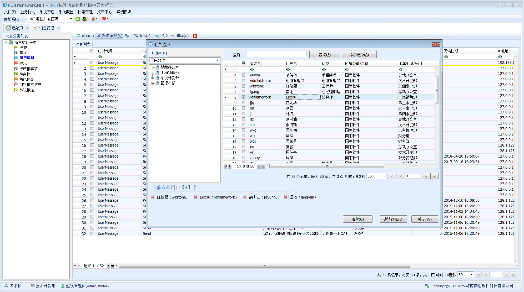 在用户选择窗口,我们可以选择多个用户。选择好用户后,返回发送消息窗口,填写好要发送的消息的消息后单击"发送"按钮,即可把消息发送给指定的用户。
