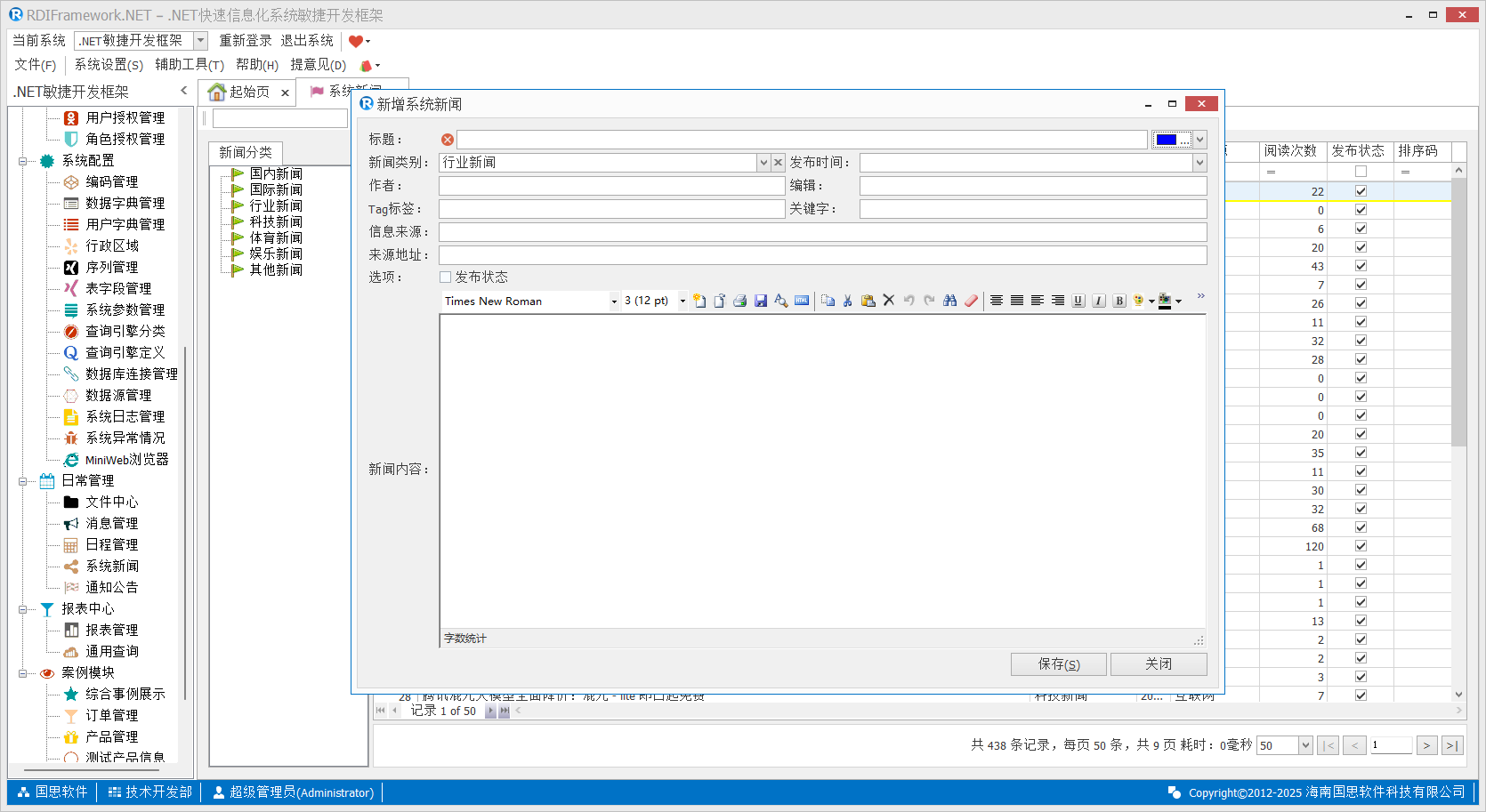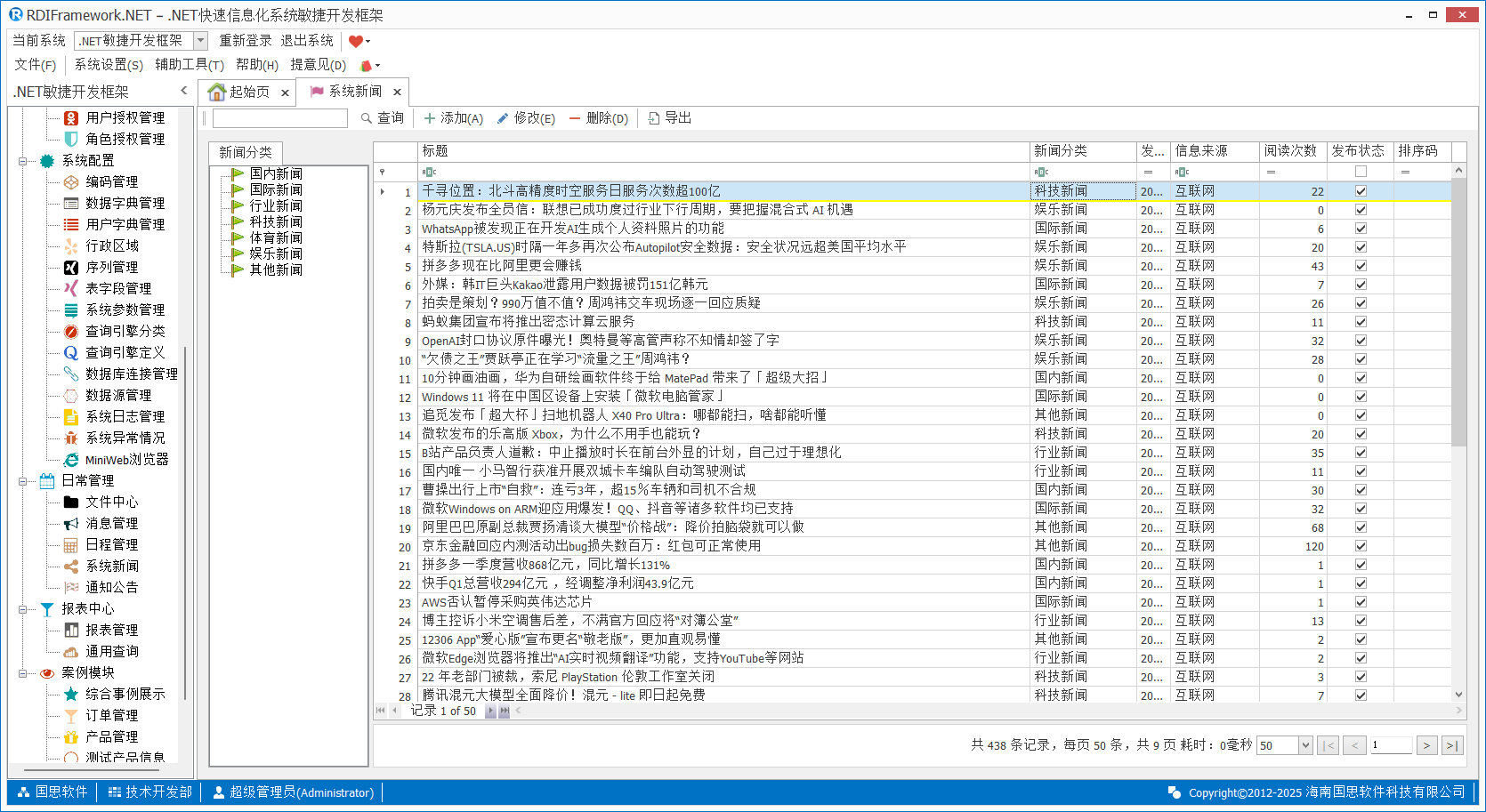 系统新闻模块用户可以根据实际情况做相应应用,如用在内部业务系统的展示中或网站上新闻的展示。新闻可以分类进行管理,非常的实用,系统新闻主界面如下所示。