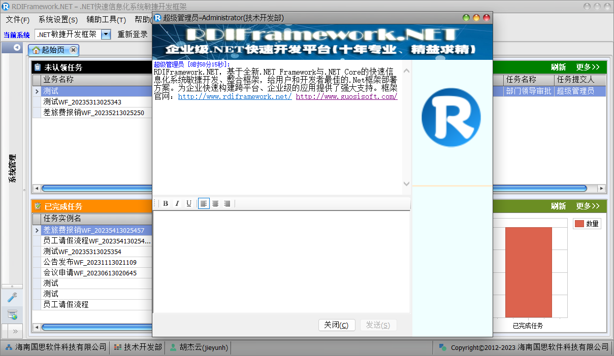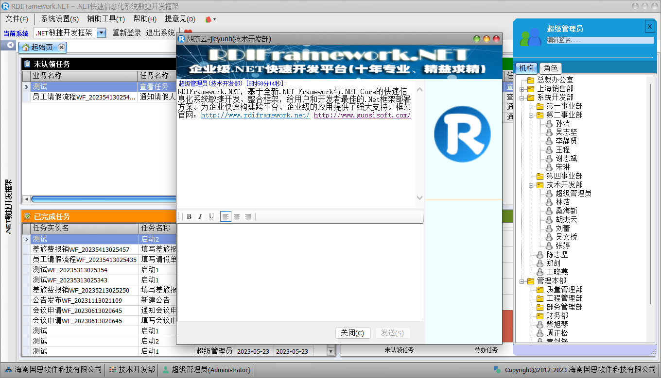 "企业通"是 RDIFramework.NET 敏捷开发框架提供的一个即时通讯、内部聊天沟通的工具。虽不能与商业化专业的沟通工具相比,但对于框架内部进行消息的沟通还是比较方便的。