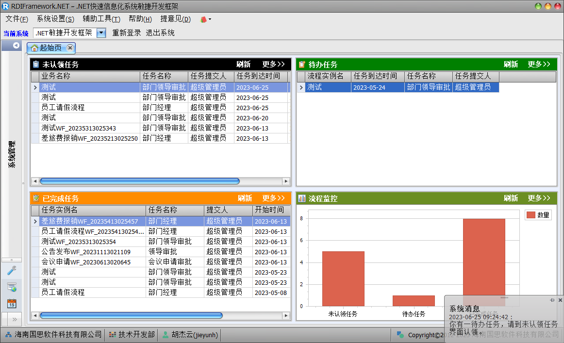 "企业通"功能不仅可以做为简单的聊天工具,同时在业务协同办公过程中也有很好的支持,如:当用户收到一个待办业务时,系统会自动在窗体的右下角弹出提示,如下图所示。