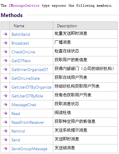 "企业通"即时通讯模块提供了常用的调用接口,不仅可以实现上面的聊天功能,业务到达、超时等常用自动提醒功能,还可以广播消息给每一个用户等功能。这些都都可以调用框架提供的接口来实现。消息服务接口如下图所示。