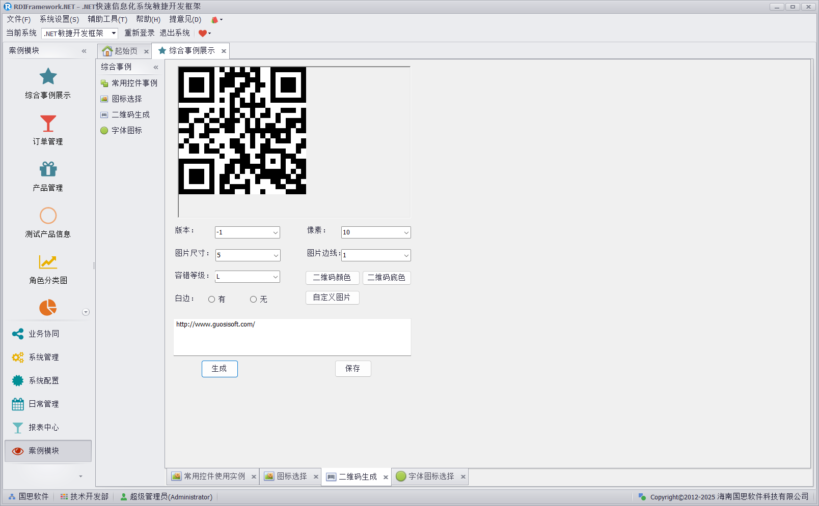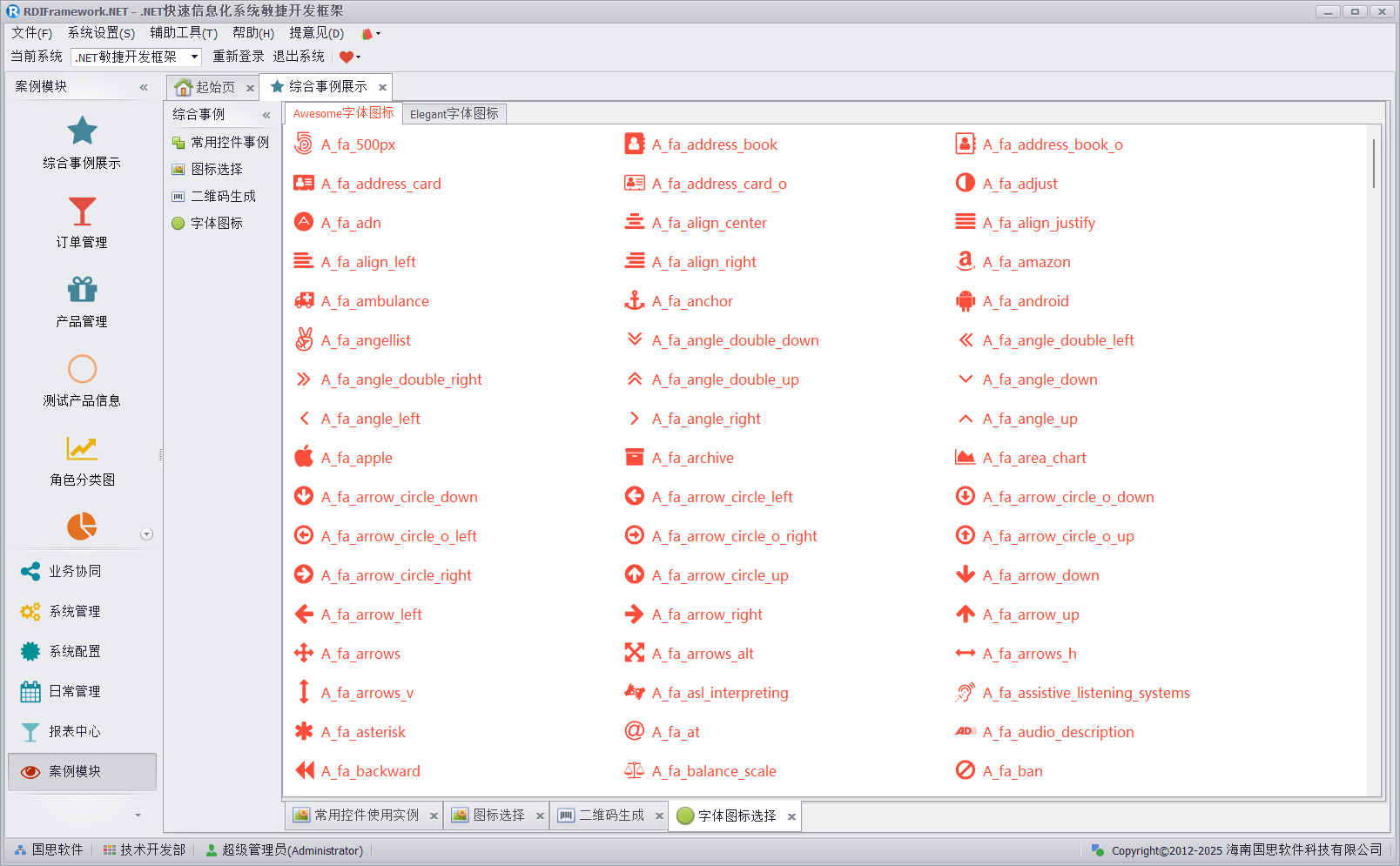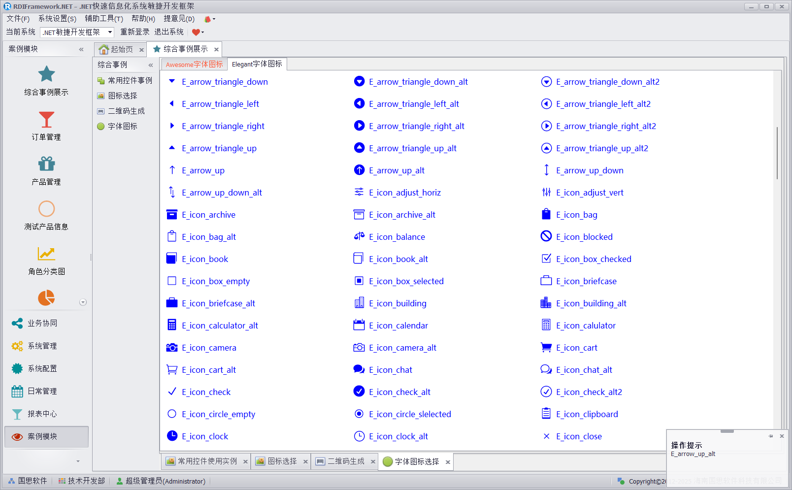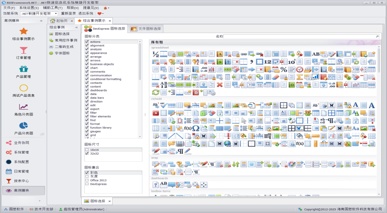 综合事例展示集 Dev 自带图标、常用控件事例、二维码生成等于一体,可供用户参考使用,图标选择如下图所示。