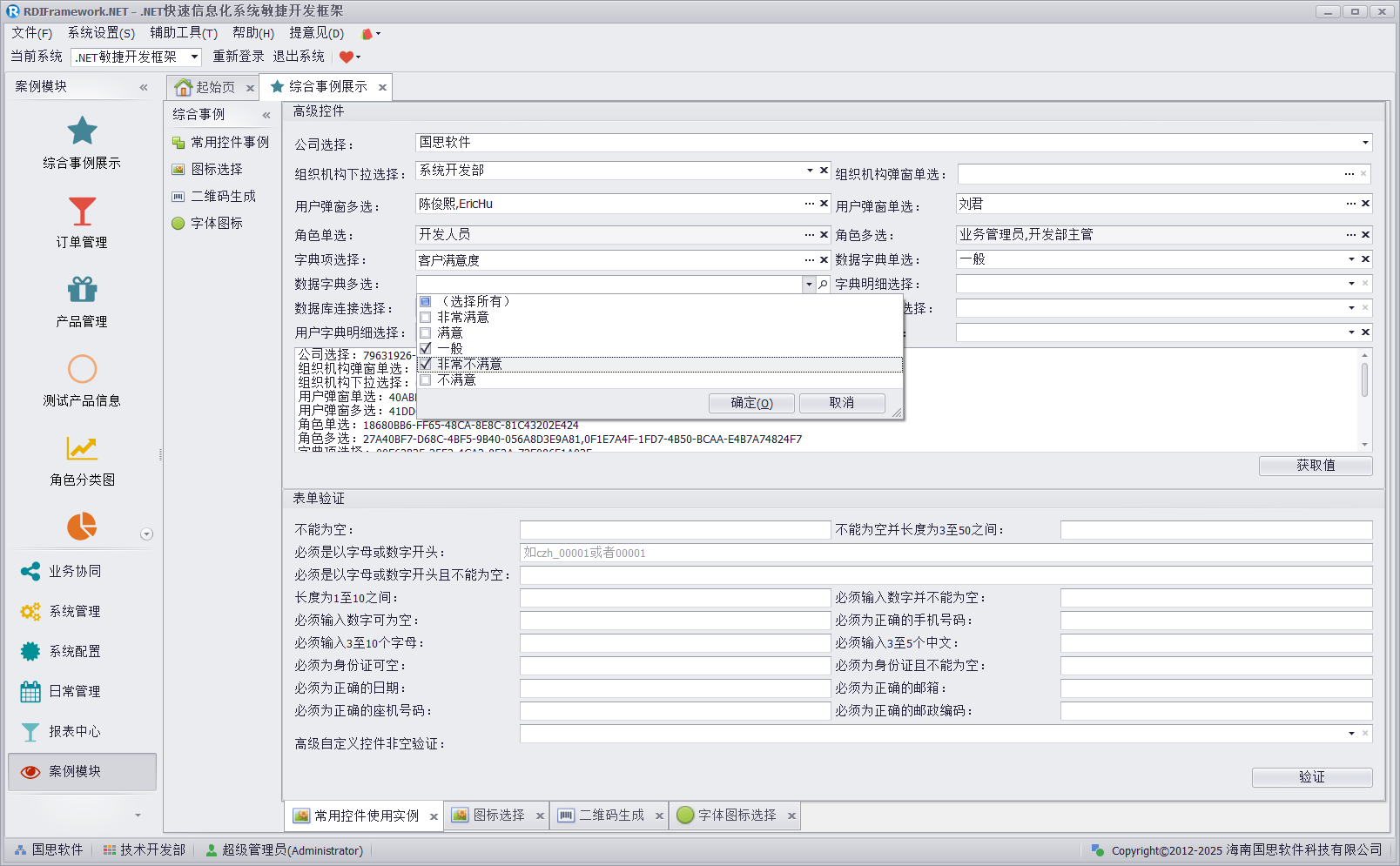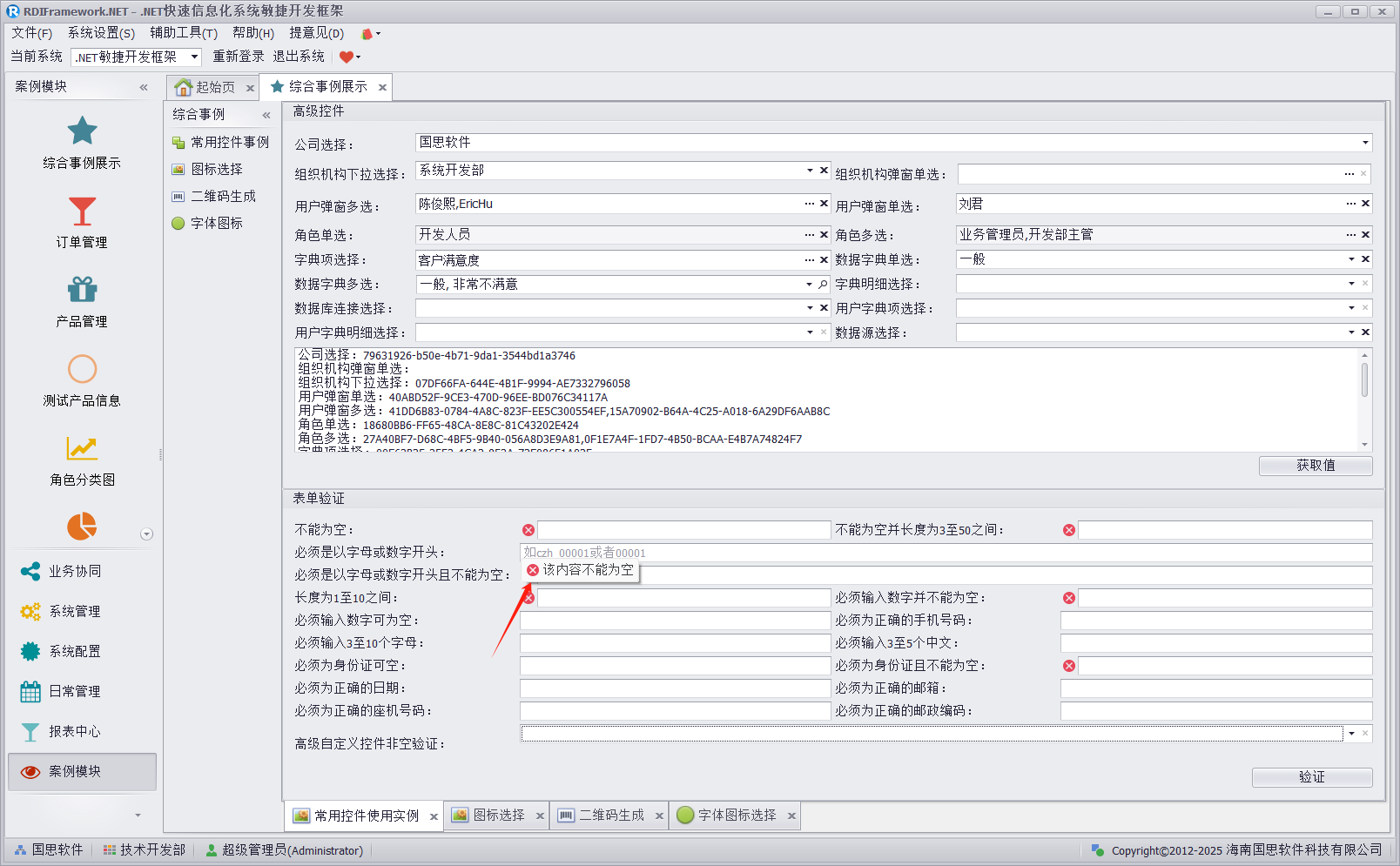 常用控件事例主要是对框架我们自主研发的一些开发过程常用的控件的演示,同时还集表单验证为一体,如下图所示。