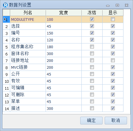 对于框架的明细显示项(通俗的讲就是显示在数据表格中的数据),用户可设置其显示的宽度、设置某列是否显示、冻结某列等。同时框架也预留了相应的接口,方便二次开发的应用。如我们在用户管理中,鼠标右键单击用户列表,选择"数据显示列设置",打开数据列设置,如下图所示。