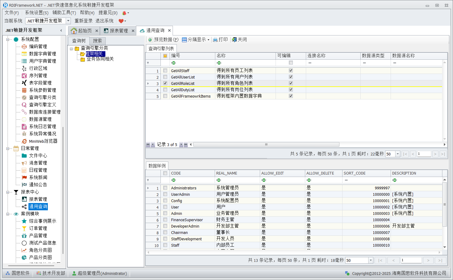 "通用查询"模块是针对"查询引擎定义"所提供的样例模块,主要就是展示得到查询引擎定义的数据,开发人员可以以此为参考进行扩展到实际应用中去,通过查询界面如下图所示。