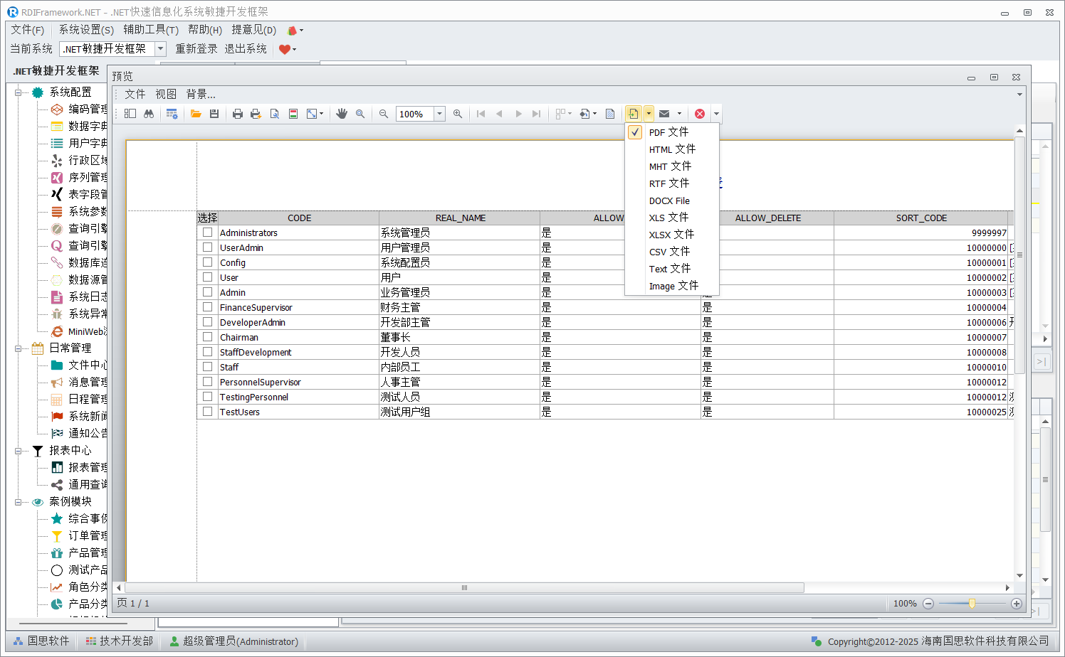 选择输出文档,则可把当前待打印的数据输出为 PDF 格式、HTML 格式、MHT 文件、RTF 文件、Excel 文件、文本文件、图片格式等,如下图
