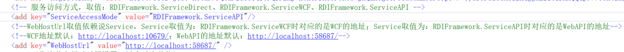 如果配置 ServiceAccessMode 为:RDIFramework.ServiceAPI,则:WebHostUrl 地址应该配置为 WebAPI 服务地址。
