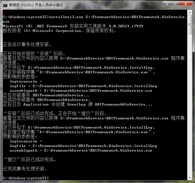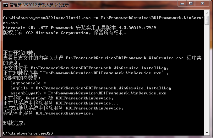 或者用 InstallUtil.exe 命令卸载框架服务也可以,如下图所示。