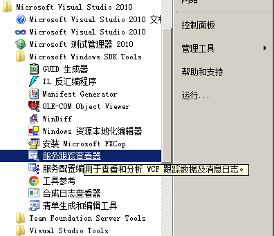 因为我们开启了 WCF 的日志功能,我们可以通过 VS 自带的"服务跟踪查看器"查看 WCF 的调用过程,当然建议在系统投入正常使用后,关闭 WCF 的日志记录功能,以免影响整个框架的效率,在此仅做测试使用,要打开 VS 的服务跟踪查看器,到开始菜单 VS 的安装菜单名下,找到"服务跟踪查看器",即可打开,如下图所示。