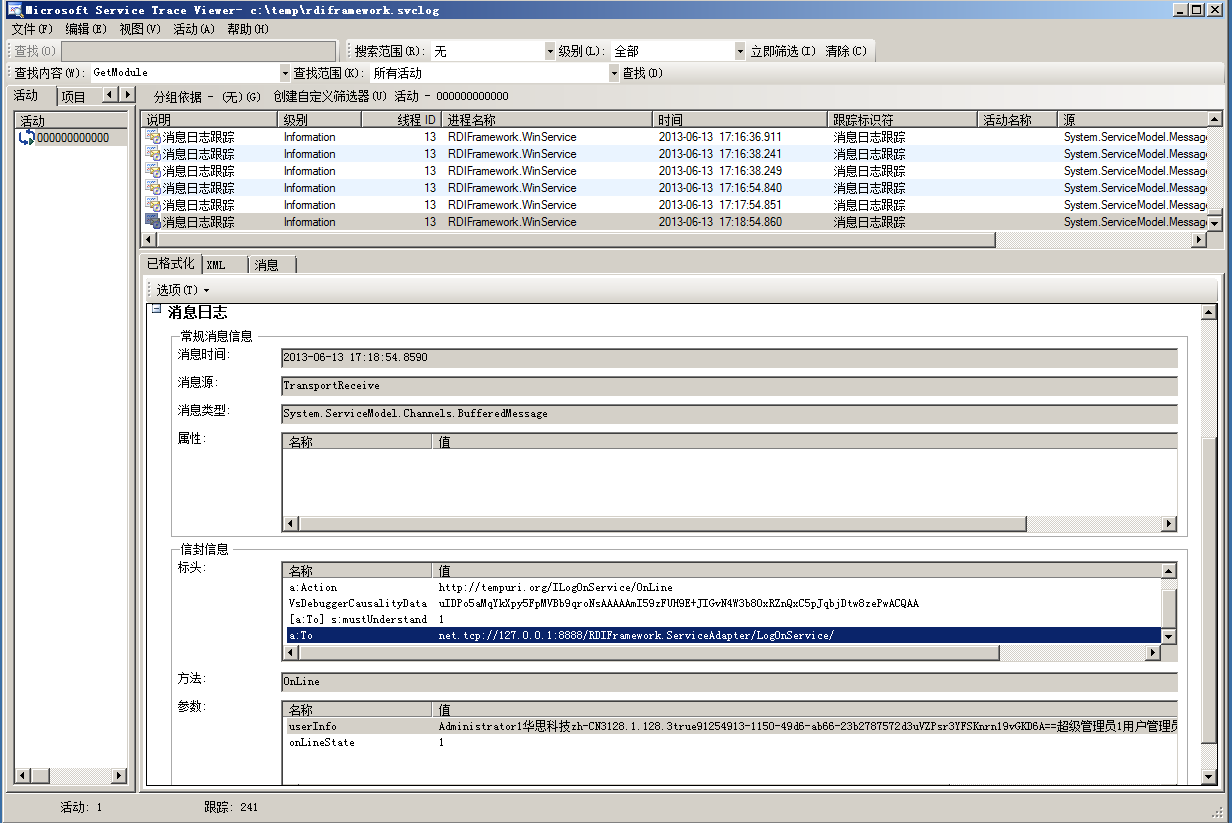 通过"服务跟踪查看器"我们可以很清楚的看到我们框架是如何调用 WCF 服务的,整个过程都详细的进行了记录,如下图所示。对于"服务跟踪查看器"的使用方法可以参考相关文档,也可以查看其自带的帮助文件。