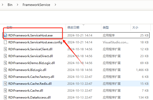 我们的框架不仅可以寄存在 Windows 服务程序中,还可以以 WinForm 形式寄存,使用方式与 Windows 服务寄存类似。以 Winform 形式寄存意思是说,服务端以窗体界面形式来启动,这种方式比较简单易懂,用户可以把启动框架服务的窗体主程序放在 Windows 自启动菜单,让开机时自动启动我们的框架服务。RDIFramework.NET 服务端以 WinForm 形式寄存运行目录:Bin\FrameworkService\RDIFramework.ServiceHost.exe,如下图所示。
