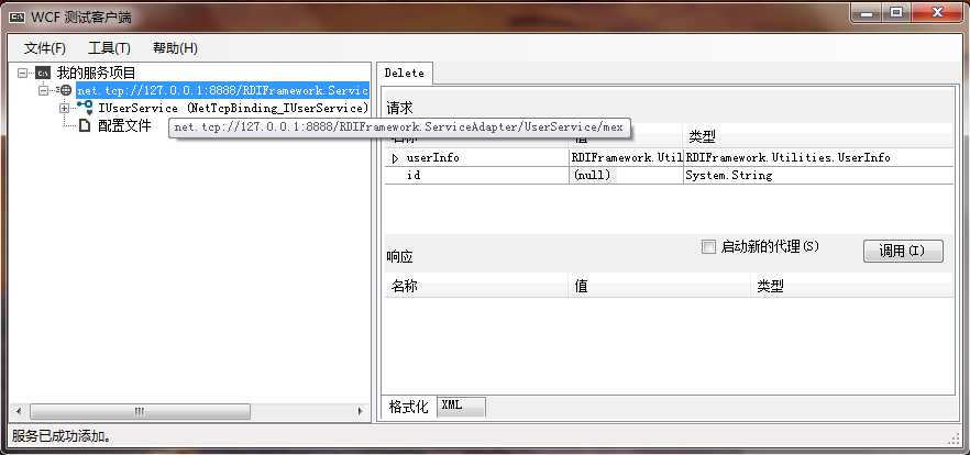 可以右键"我的服务项目"选择"添加服务(A)..."来添加 WCF 服务,在上图中,我们输入"net.tcp://127.0.0.1:8888/RDIFramework.ServiceAdapter/UserService/mex"添加了对用户服务的测试调用。