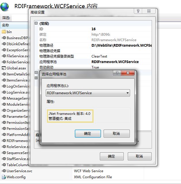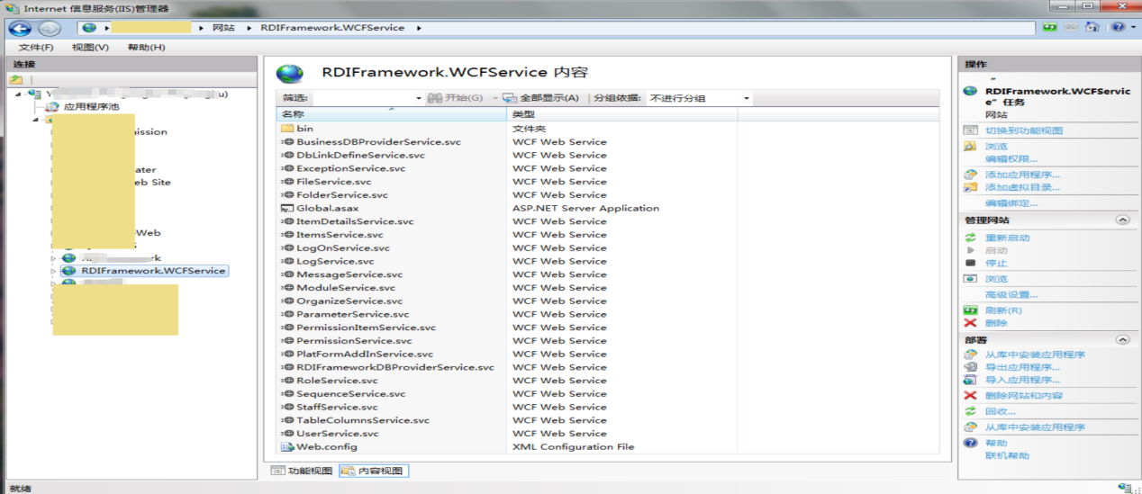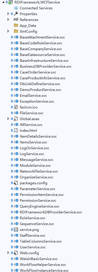要以 IIS 方式来寄存框架的 WCF 服务,首先我们需要把"RDIFramework.WCFService"项目发布到 IIS 下,发布的方法与常规的 Web 发布方式一样,可以参照相关的文章,RDIFramework.WCFService 项目如下图所示。