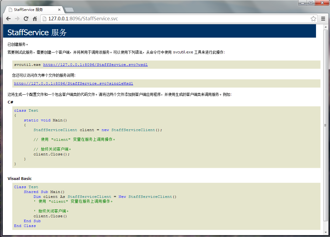 至此,我们可以用浏览器来浏览我们发布的服务,测试发布的服务是否成功,如下图所示,我们测试 StaffService 服务。