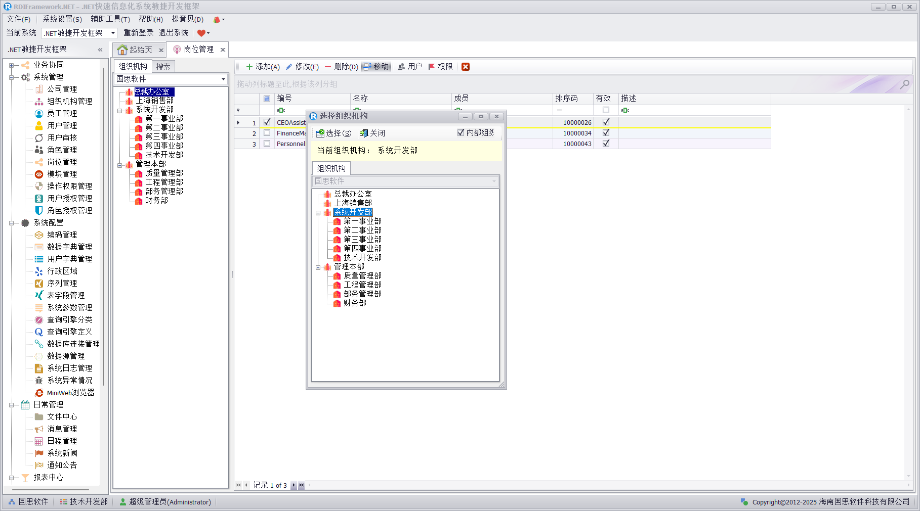 岗位的变动也是时有的事,这时我们就不用进行修改操作,直接进行移动就可以了,方便快捷,单击移动岗位,弹出选择要移动到的组织机构,如下图所示。