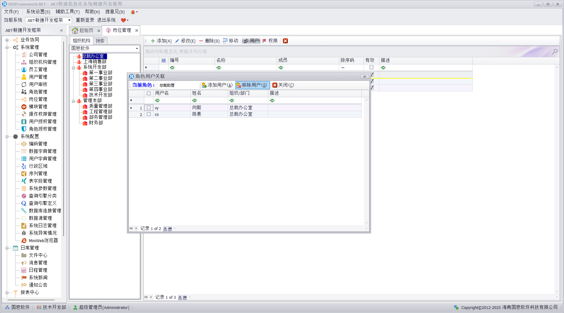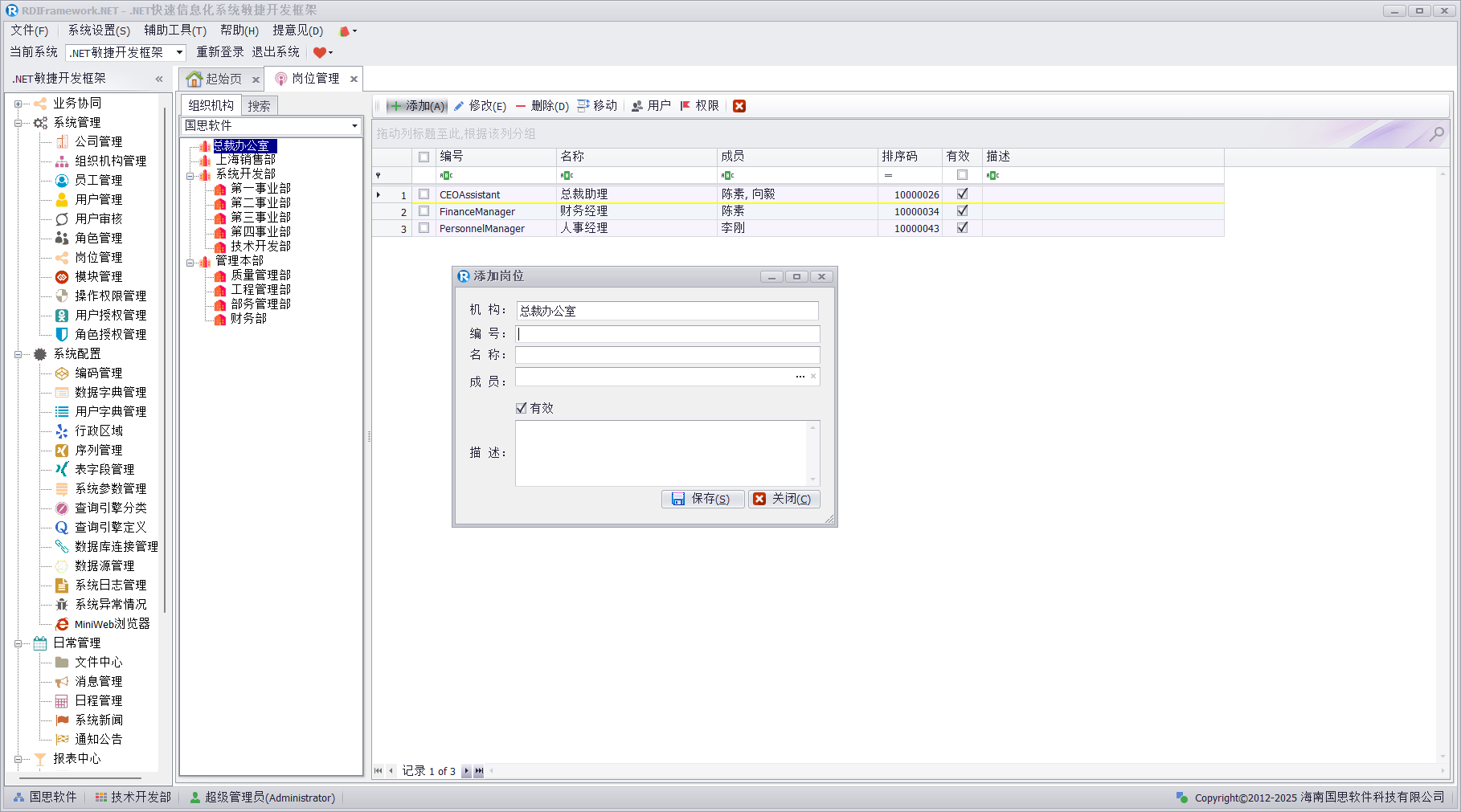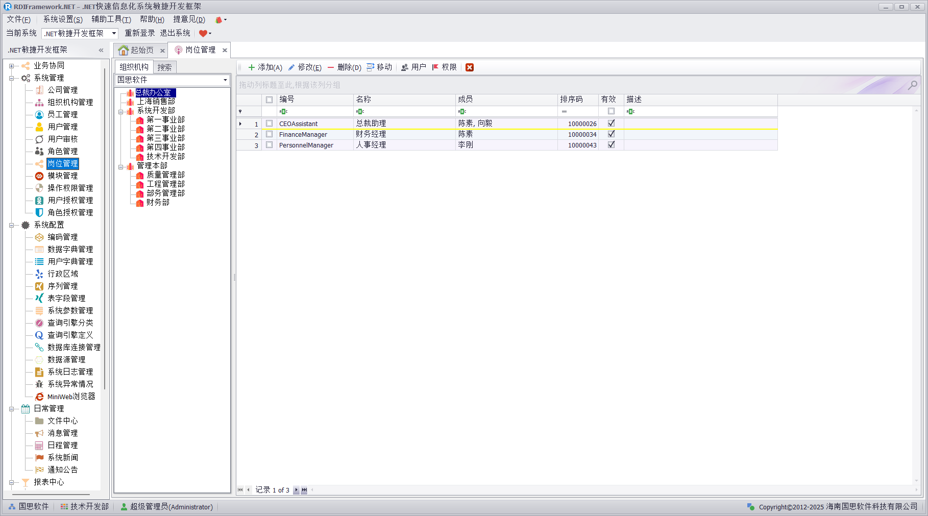 岗位(职位)管理模块主要是针对组织机构的岗位(职位)进行管理,包括:增加、修改、删除、移动、对岗位设置用户,设置岗位的权限等。岗位管理在企业应用中是一个普遍应用的模块,也属于其他业务应用的基础。合理的组织与规划组织机构下的岗位,对后期的管理可以起到事半功倍的效果。