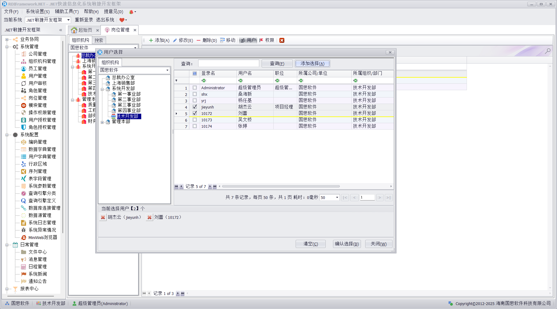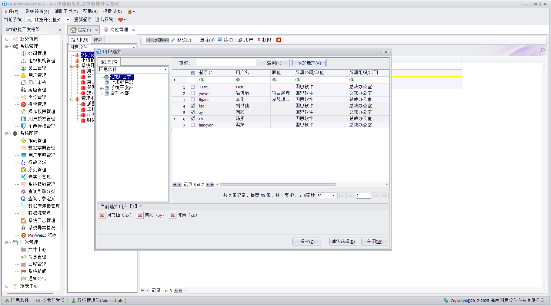 在添加岗位窗口,我们可以选择当前岗位所拥有的成员(用户列表),单击"成员"后的"...",可以打开"用户选择"窗口,如下图所示。在"用户选择"窗口自动按当前组织对用户进行了过滤。