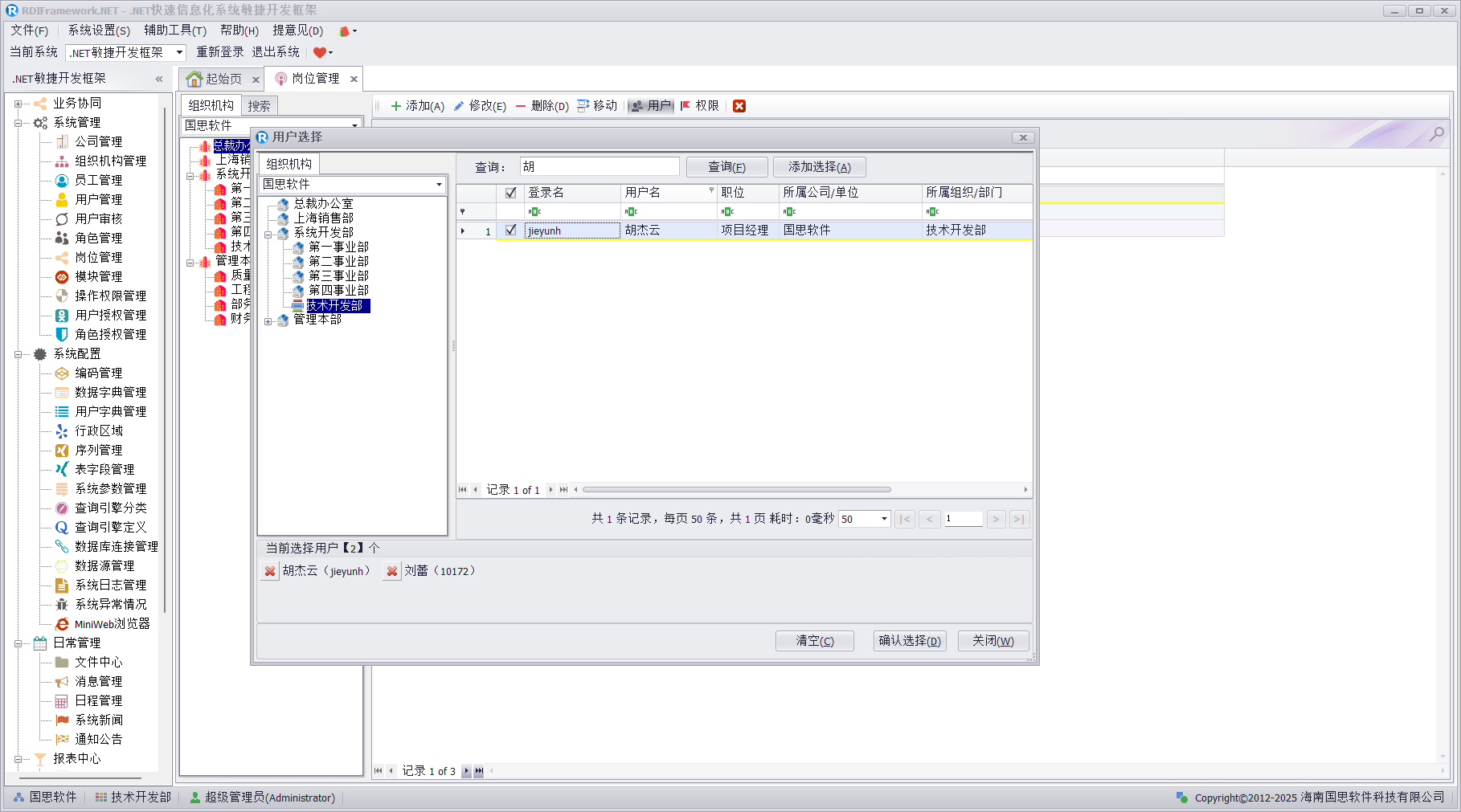 在用户选择界面可以按 Control 键进行多选,否则为单选,选择好用户后单击"选择"按钮即可把我们选择的用户添加到当前岗位中。如果用户过多,我们还可以进行模糊查询进行展示,如下图所示。