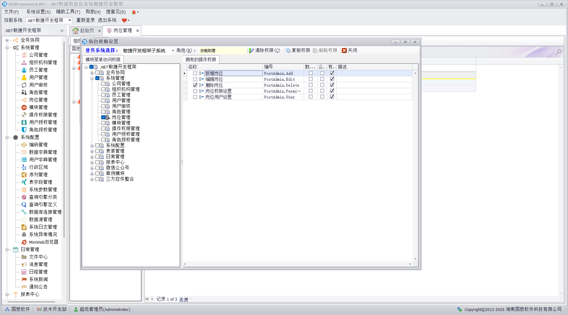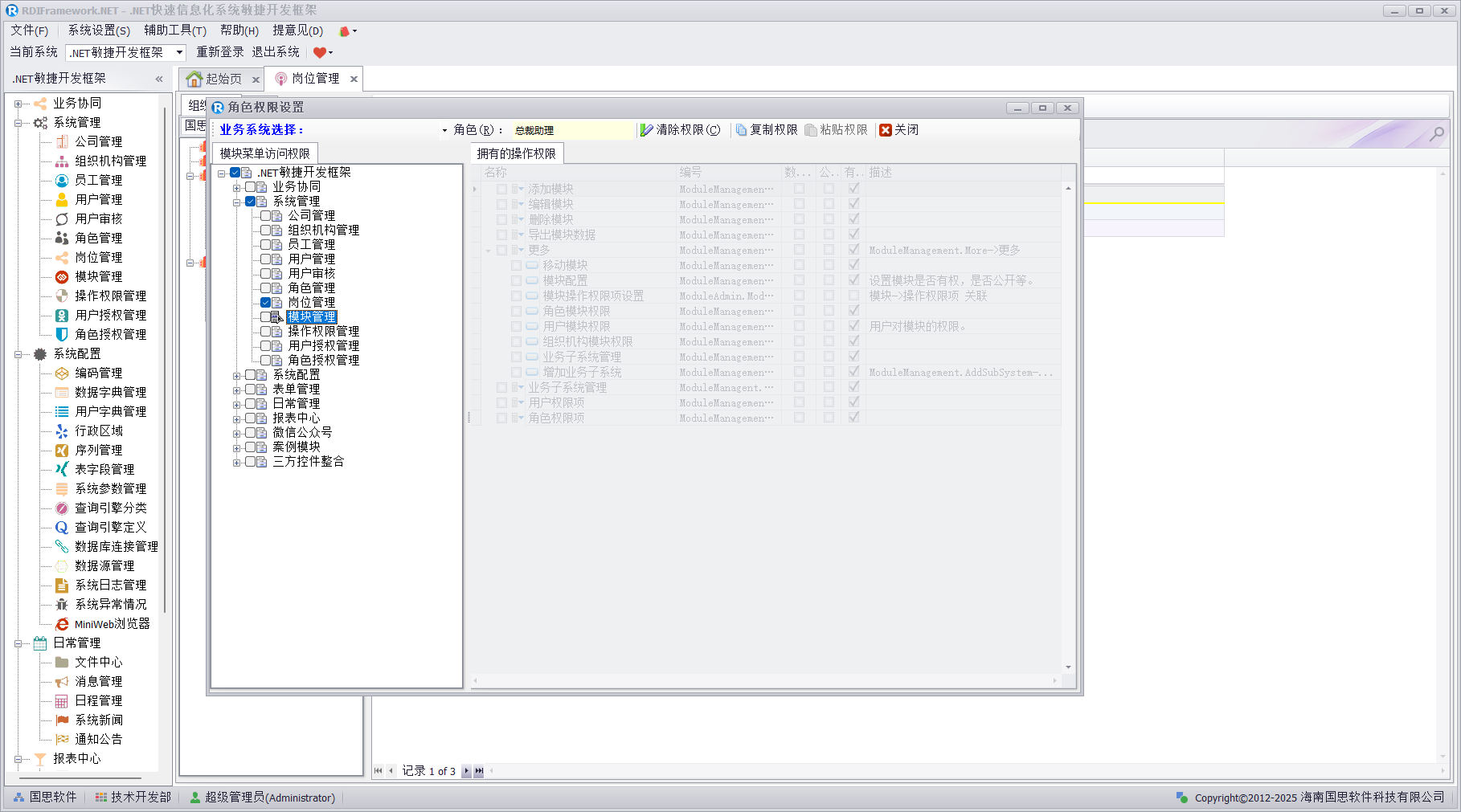 岗位权限设置界面,我们可以对所选岗位设置其可访问的模块(菜单),拥有的操作权限,如下图所示。