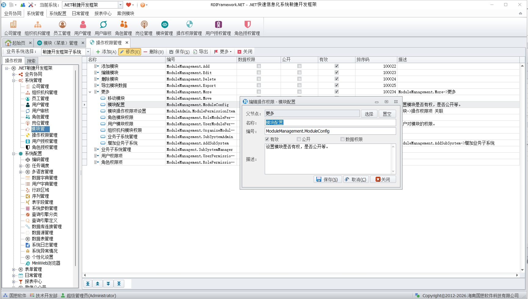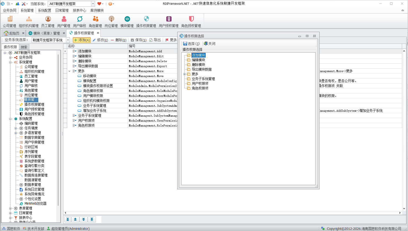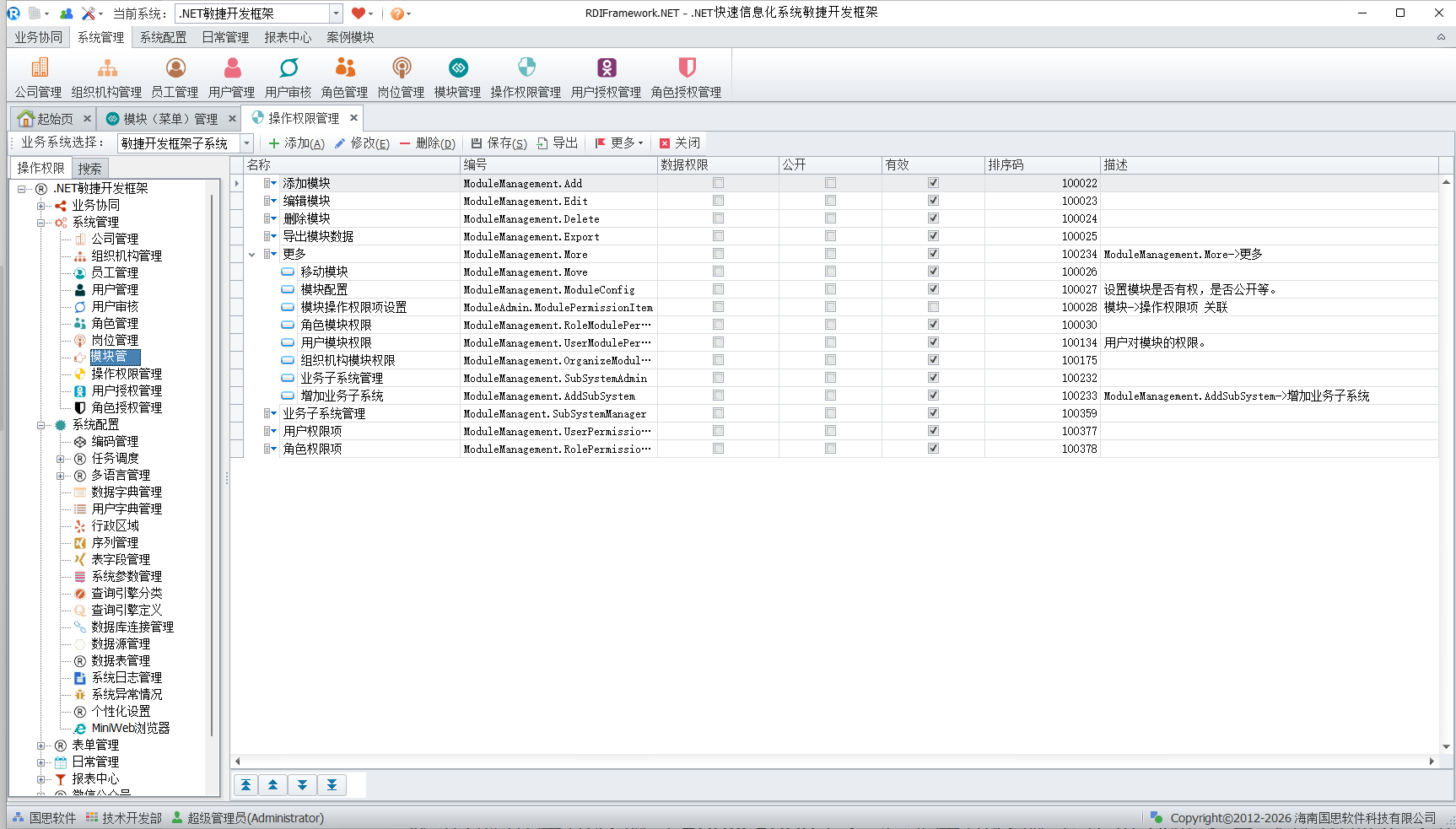 在操作(功能)权限管理主界面可方便的对操作权限进行添加、修改、删除、移动与合并、导出操作权限到本地、同时可设置角色或用户的操作权限、对操作权限项进行排序等功能。