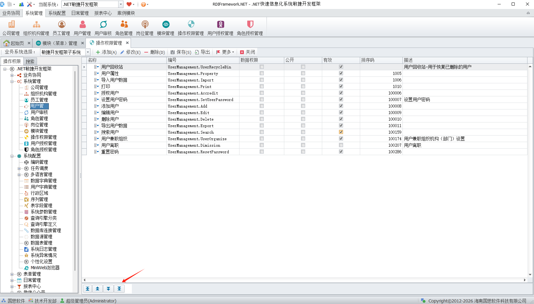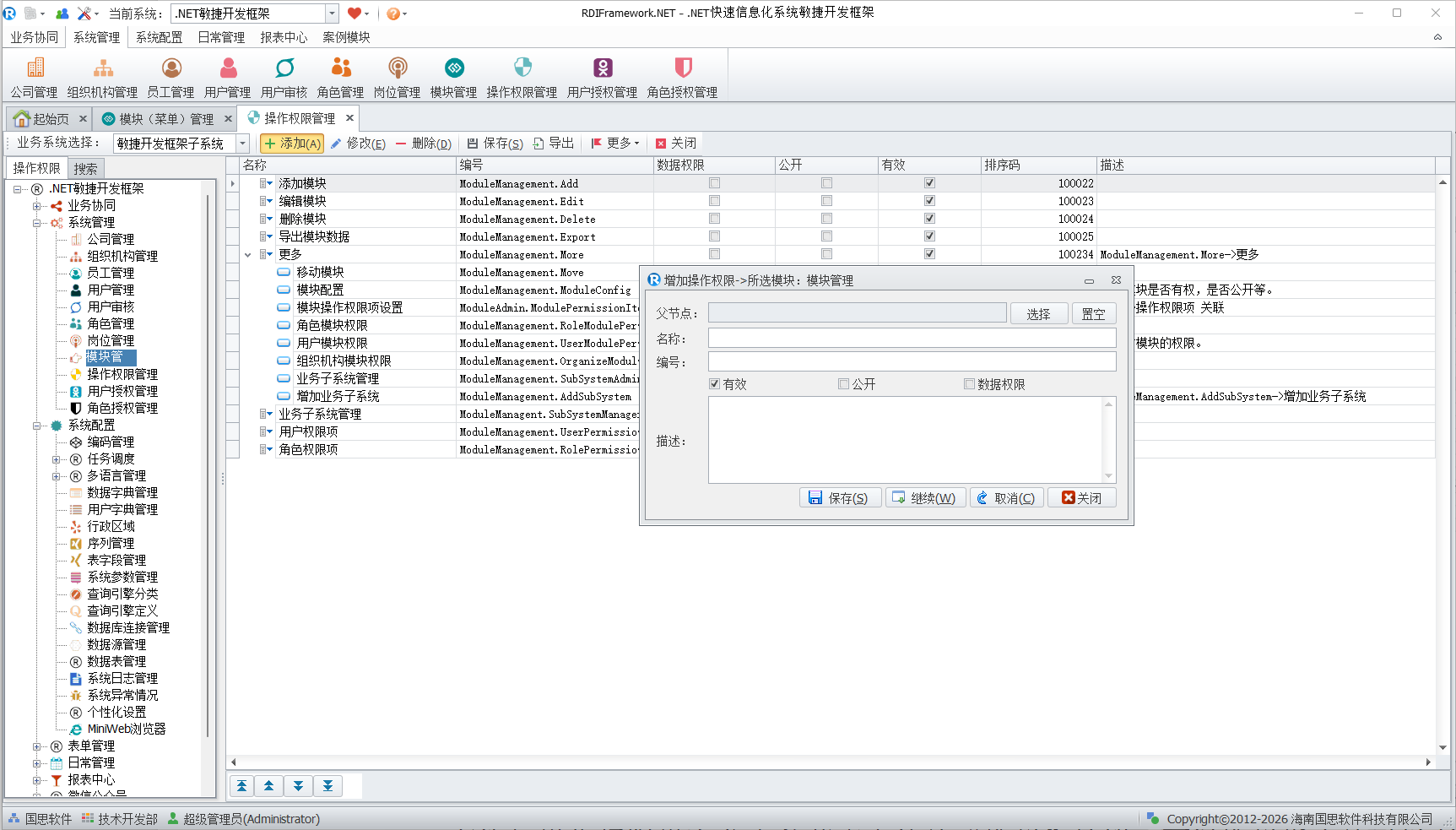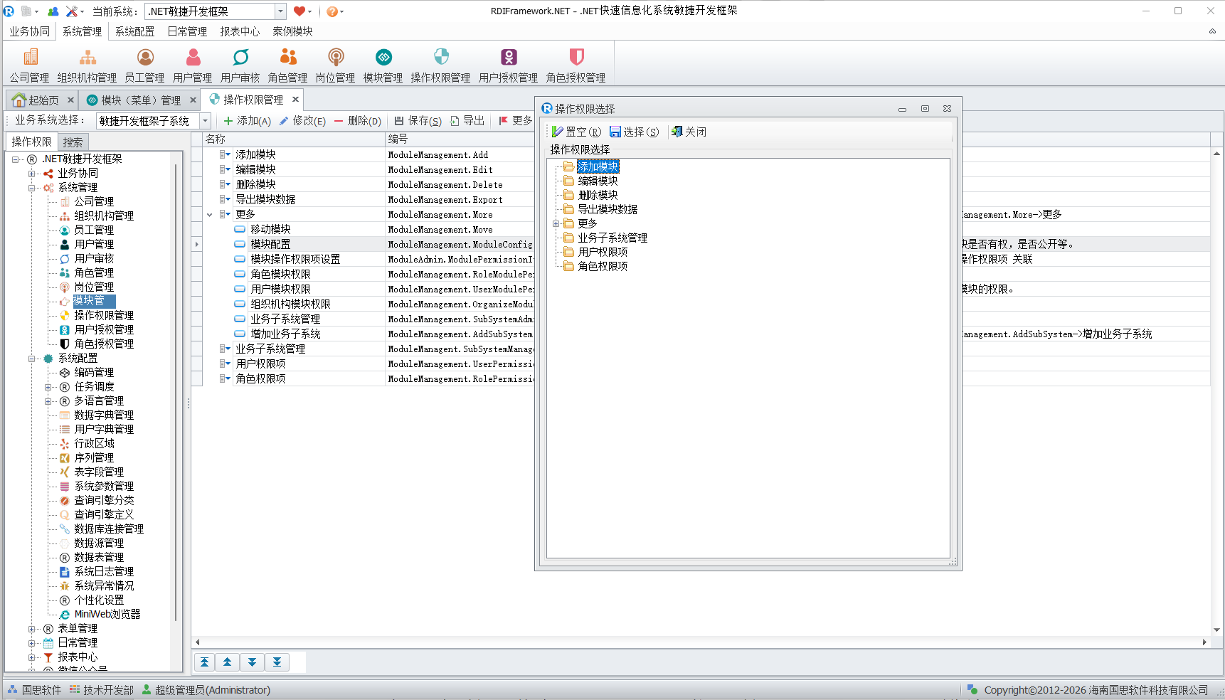 在操作(功能)权限管理主界面可方便的对操作权限进行添加、修改、删除、移动与合并、导出操作权限到本地、同时可设置角色或用户的操作权限、对操作权限项进行排序等功能。