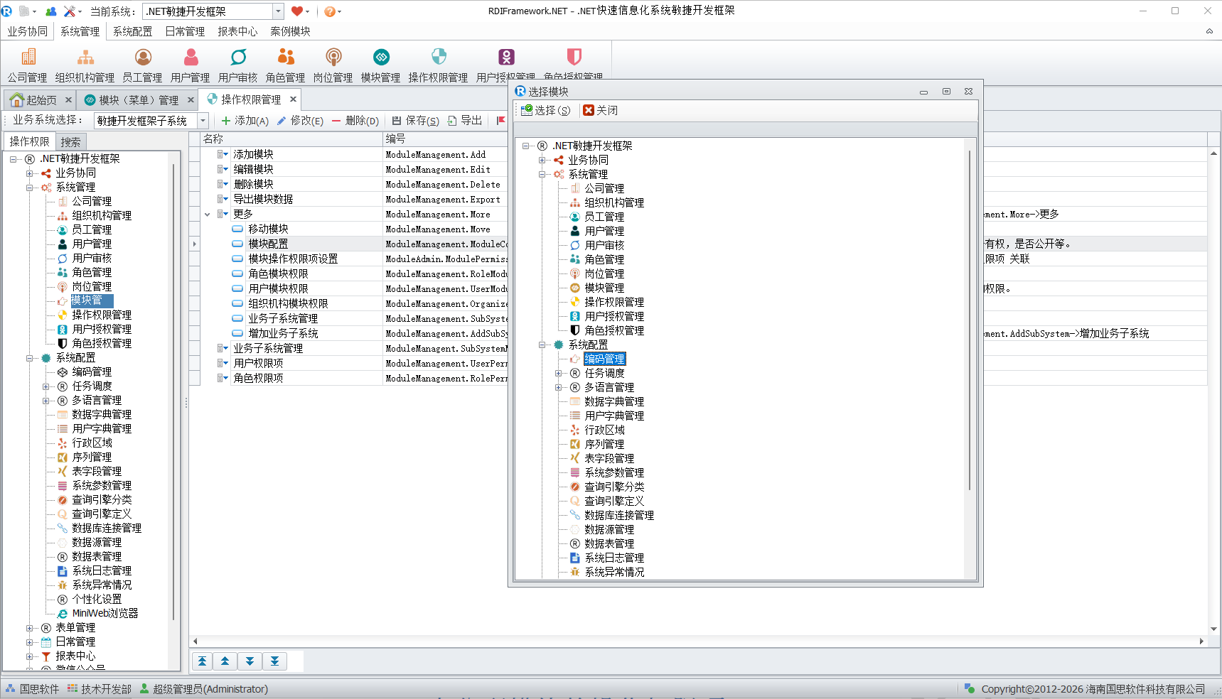 随着经济全球化趋势的发展和企业间竞争的加剧,企业对管理要求不断变化、提高,越来越多的信息都表明权限管理必须向更细、更深的方向发展,其目的就是为了更好的发挥监督职能,对不相容的资源进行分离与牵制,对重要的事项进行监督与制约,重点突出精细化管理的要求。操作权限管理模块是框架权限控制的核心,贯穿于整个框架应用之中。这里的操作权限不能简单理解为一些常用的增、删、改、查,应进行更深入的分析与挖掘。比如可访问框架的权限,可访问、编辑、删除、拒绝访问某些列的权限、框架资源的管理权限等等。在开发一个系统时不可能一下子把这些权限完整的抽象出来,是一个循序渐进的过程,合理的权限粒度抽象更能方便后期的管理,操作权限管理主界面如下图所示。