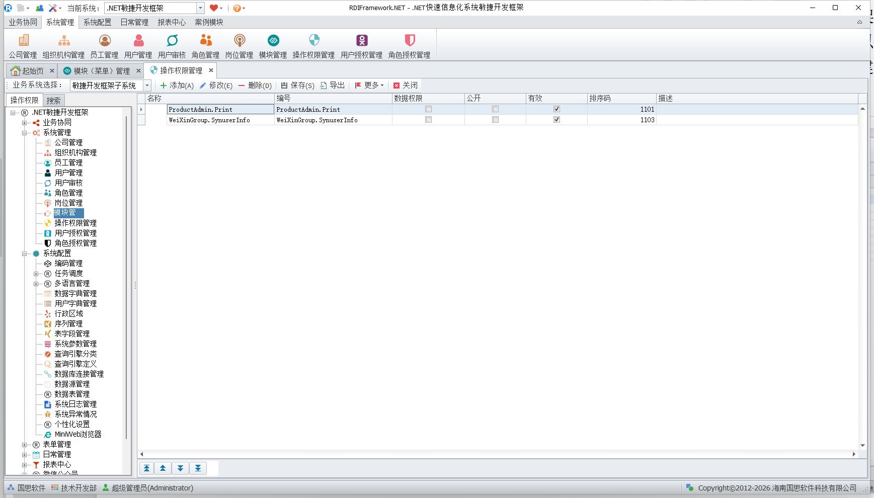 操作(功能)权限主要分为两大类,一类为:系统操作权限(System),另一类为业务/应用操作权限(Application)。系统操作权限主要是为框架自身使用而定义的操作权限,而业务/应用操作权限则是开发人员在做实际的应用开发时所定义的操作权限。对于用户角色为用户管理员(UserAdmin)的系统角色,默认拥有所有的系统操作权限而不需要分配。对于用户角色为业务管理员(Admin)的系统角色,默认拥有所有的业务/应用操作权限而不需要分配。