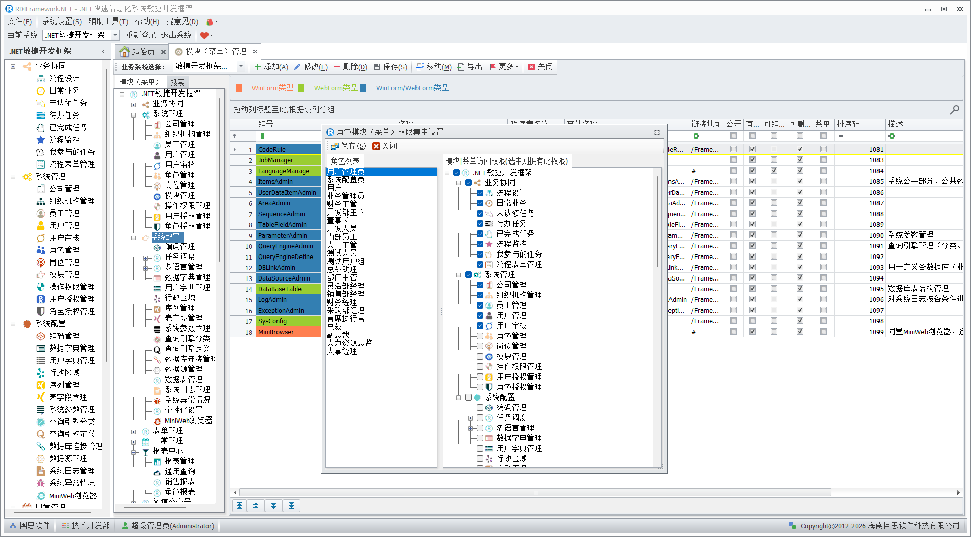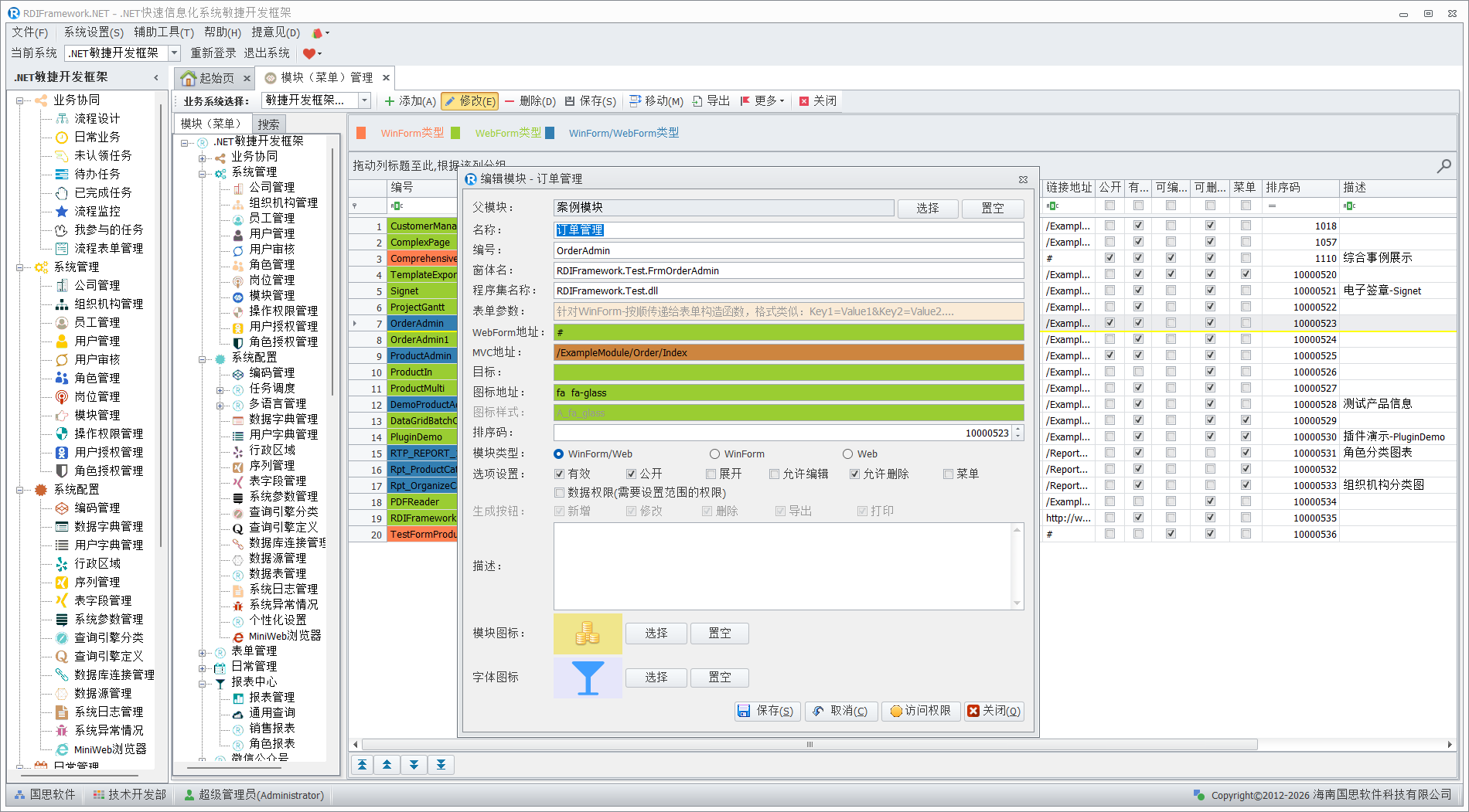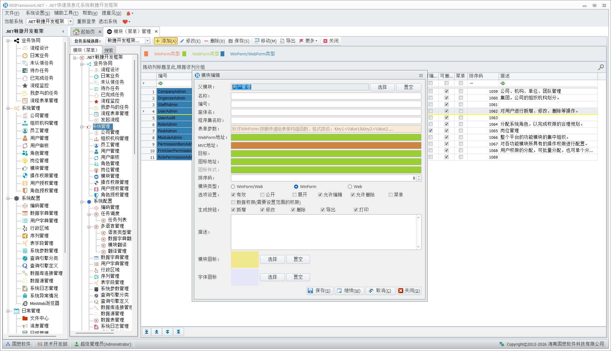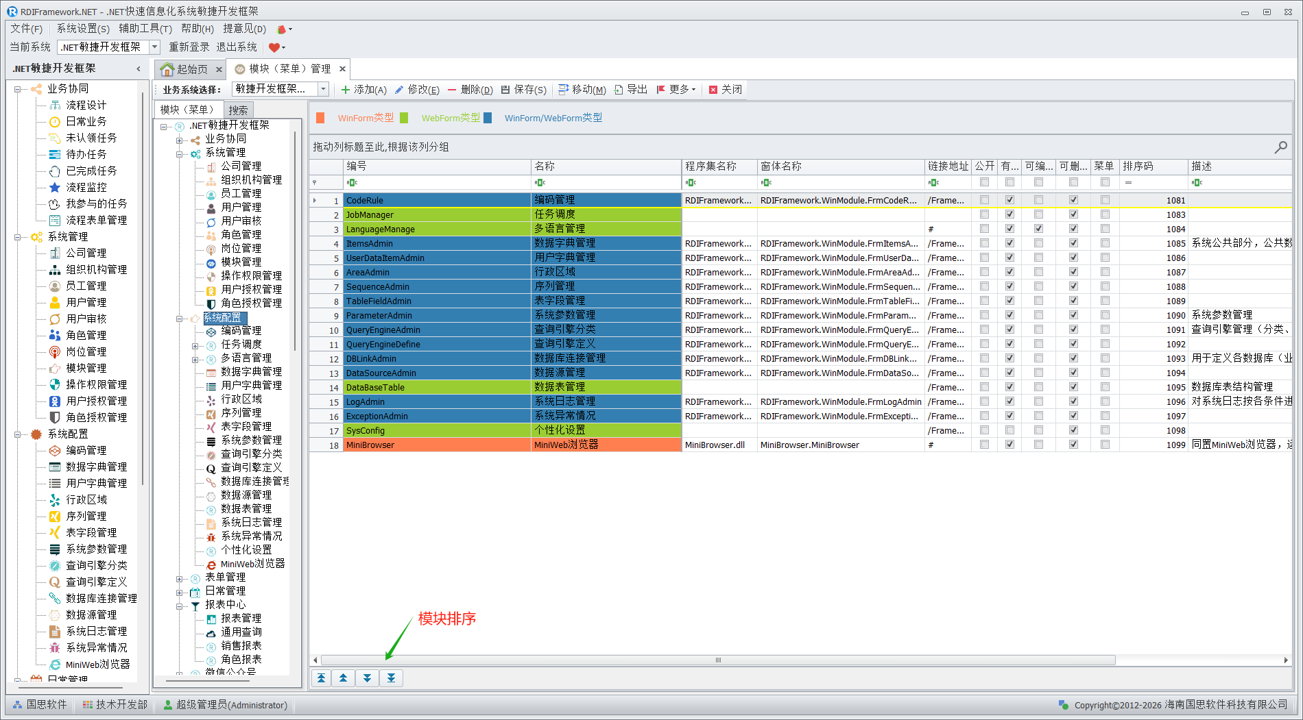 模块(菜单)管理是整个框架的核心,主要面向系统管理人员与开发人员,对普通用户建议不要授予访问此模块的权限,以免不必要的错误影响整个框架的运行。在框架中看到的各个功能模块都是在这儿进行配置的,配置信息保存在数据库中。模块(菜单)管理主要完成对整个框架各功能模块的添加、修改、删除,模块的移动、合并,模块启用、停用,设置模块是否为公共模块,分配角色、用户的模块访问权限,设置模块的可见性,对模块进行排序等。各个模块(菜单)以不同颜色来区分相应的模块类型。