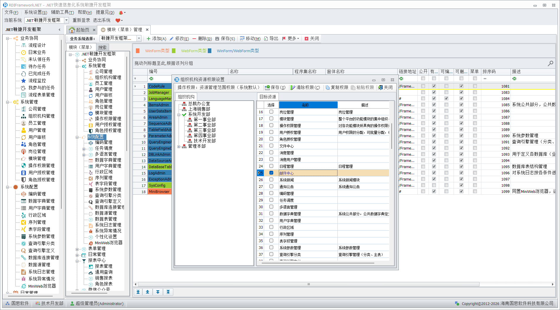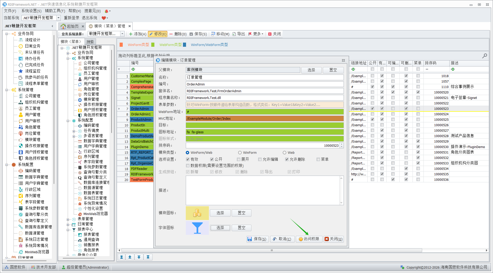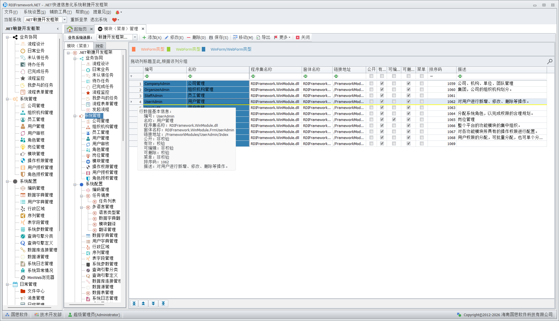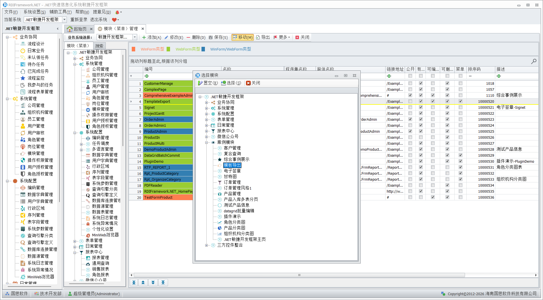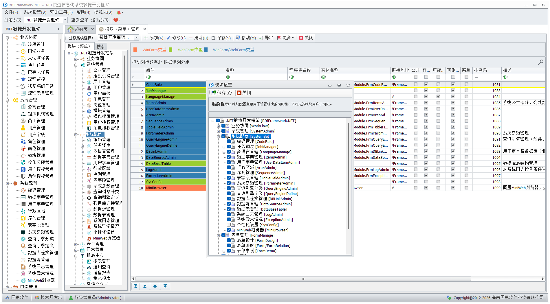 模块(菜单)管理是整个框架的核心,主要面向系统管理人员与开发人员,对普通用户建议不要授予访问此模块的权限,以免不必要的错误影响整个框架的运行。在框架中看到的各个功能模块都是在这儿进行配置的,配置信息保存在数据库中。模块(菜单)管理主要完成对整个框架各功能模块的添加、修改、删除,模块的移动、合并,模块启用、停用,设置模块是否为公共模块,分配角色、用户的模块访问权限,设置模块的可见性,对模块进行排序等。各个模块(菜单)以不同颜色来区分相应的模块类型。