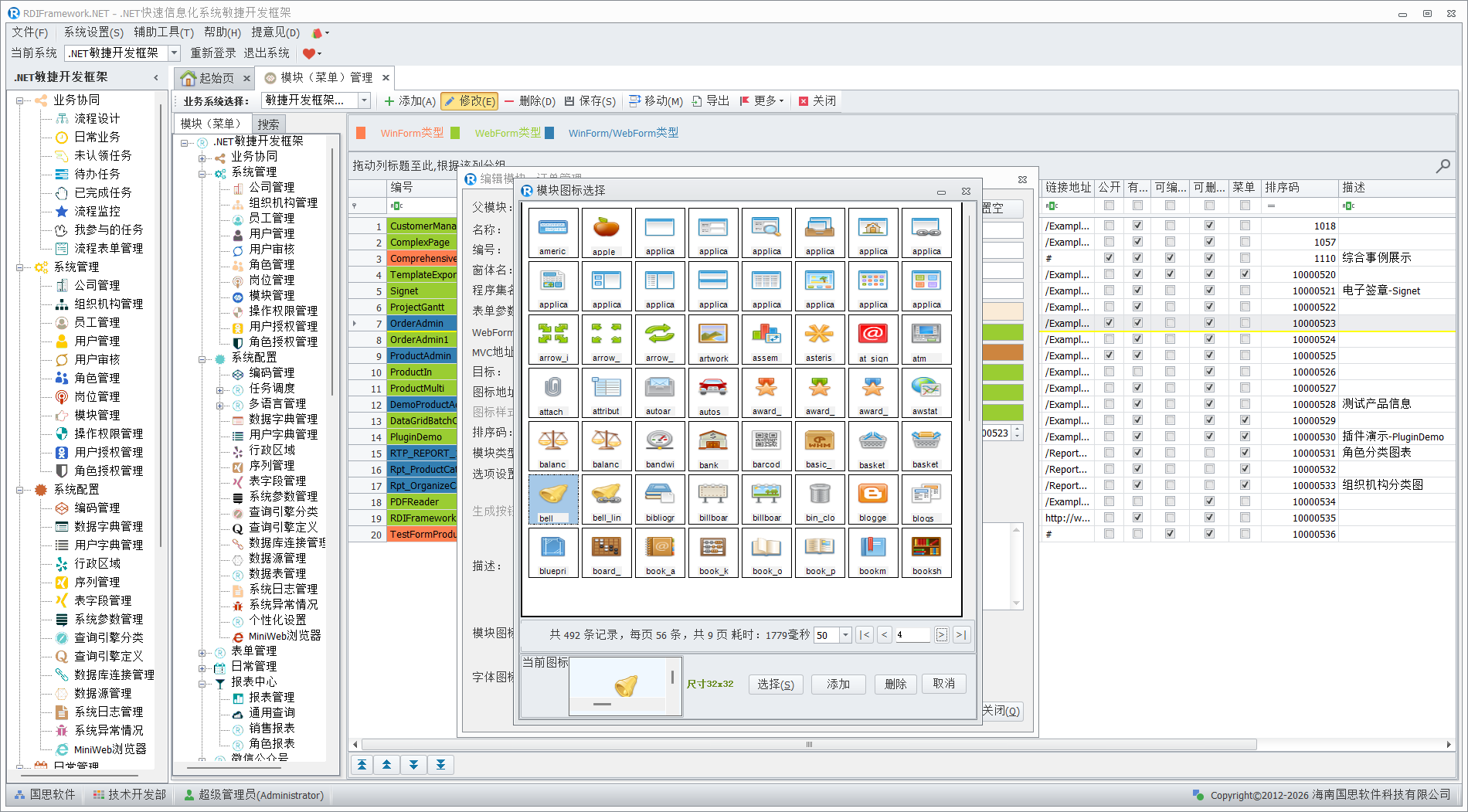 单击"选择"按钮,打开"模块(菜单)图标选择"界面进行模块图标的选择,在模块图标选择窗口对图标进行了分页显示 ,提高加载的效率。如下图模块(菜单)图标选择所示。