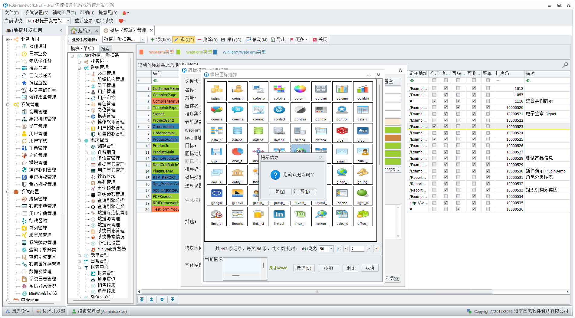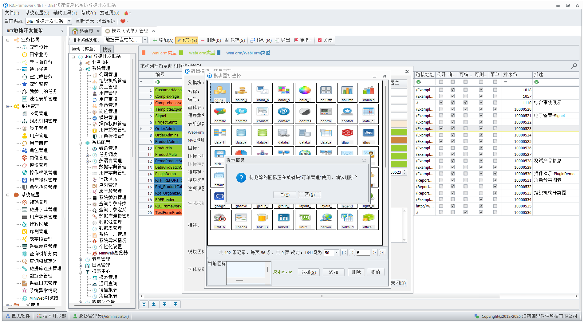 同时对于不需要的模块可以删除,在进行删除前如果此图标正在被系统使用,则会弹出提示,并默认选择的是"否(N)"按钮,防止误删,如下图所示。