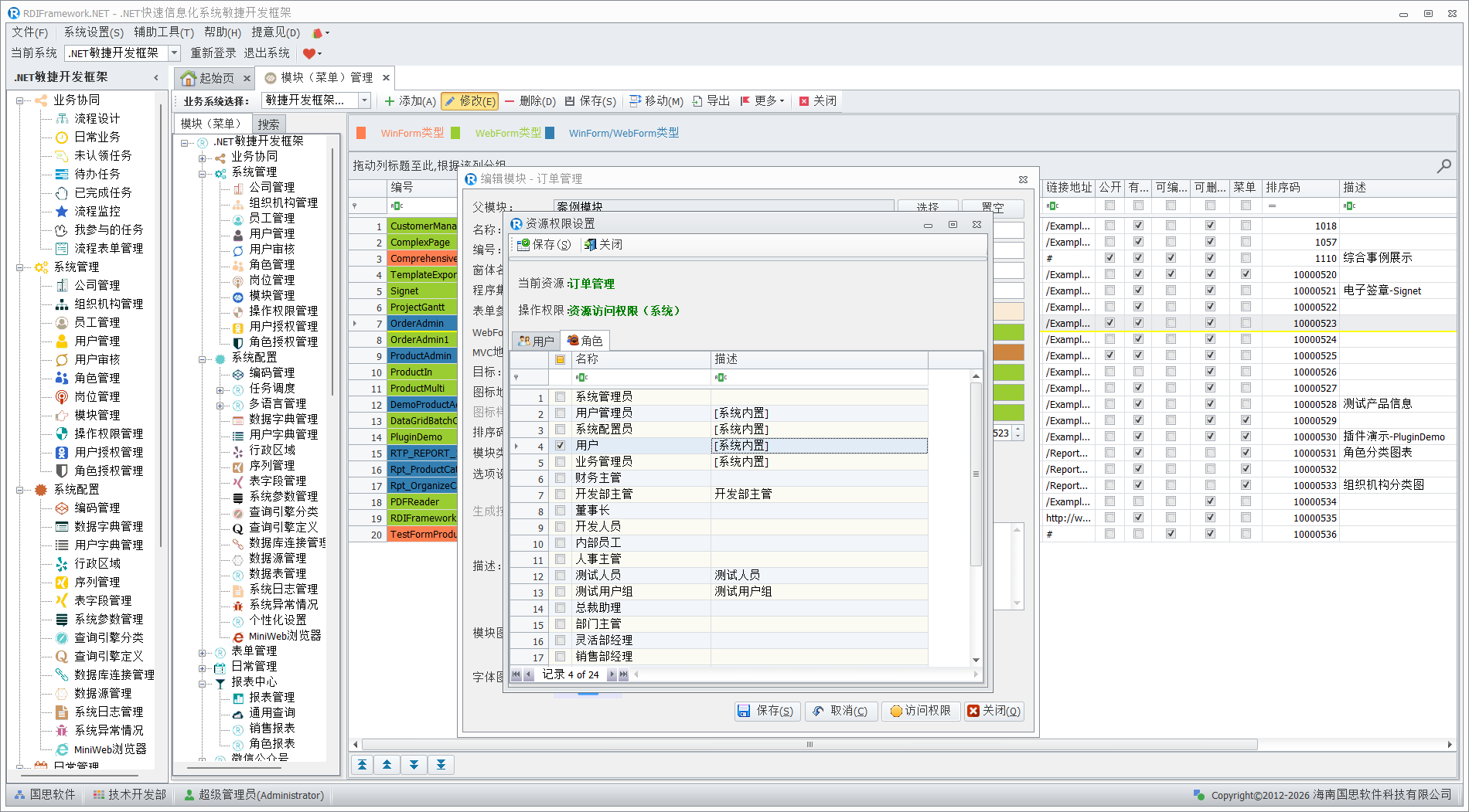 在上图的资源权限设置窗口,我们可以方便快速的设置那些用户,那些角色可以访问当前编辑的模块。