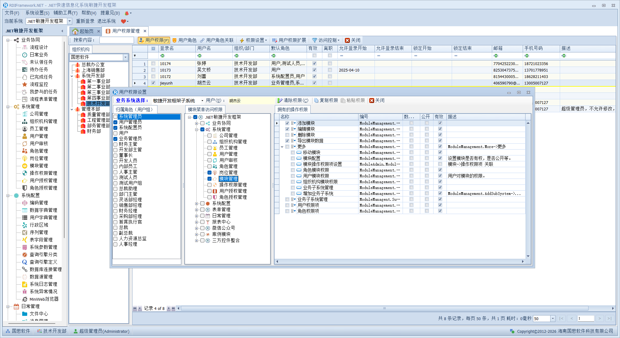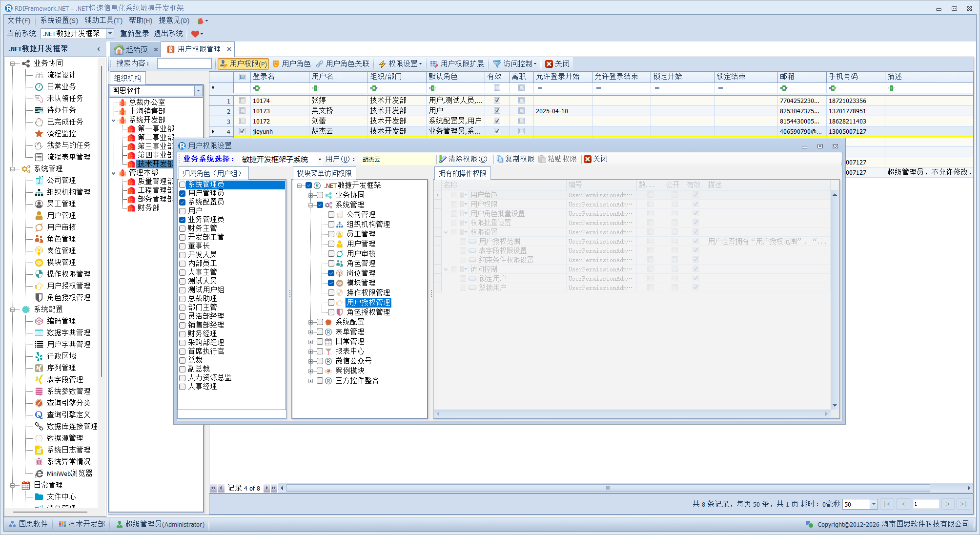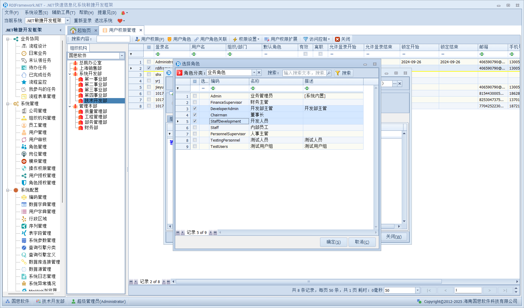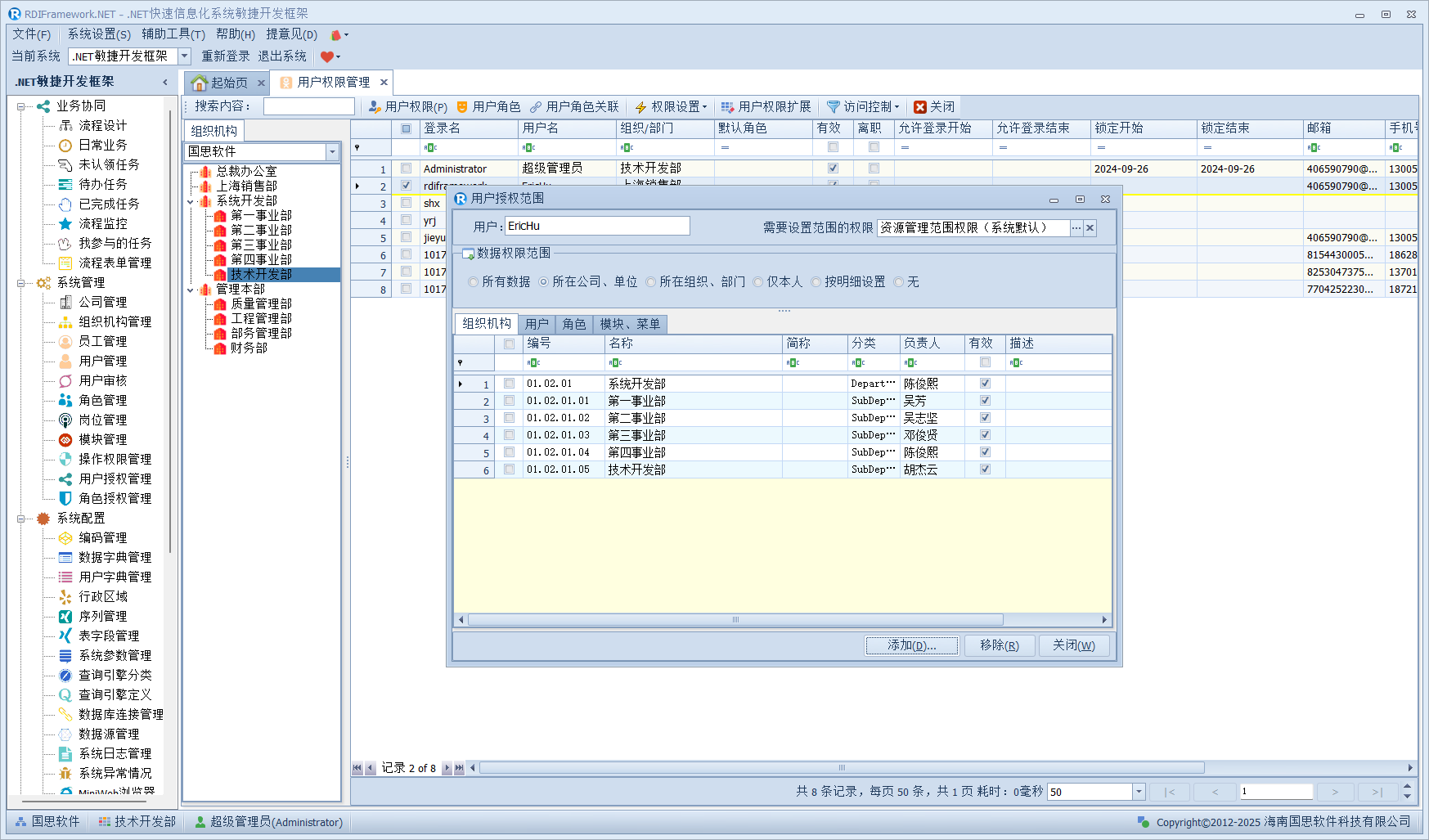下面我们演示下范围权限,比如当前用户"rdiframework"授予的组织机构范围权限如下图所示。