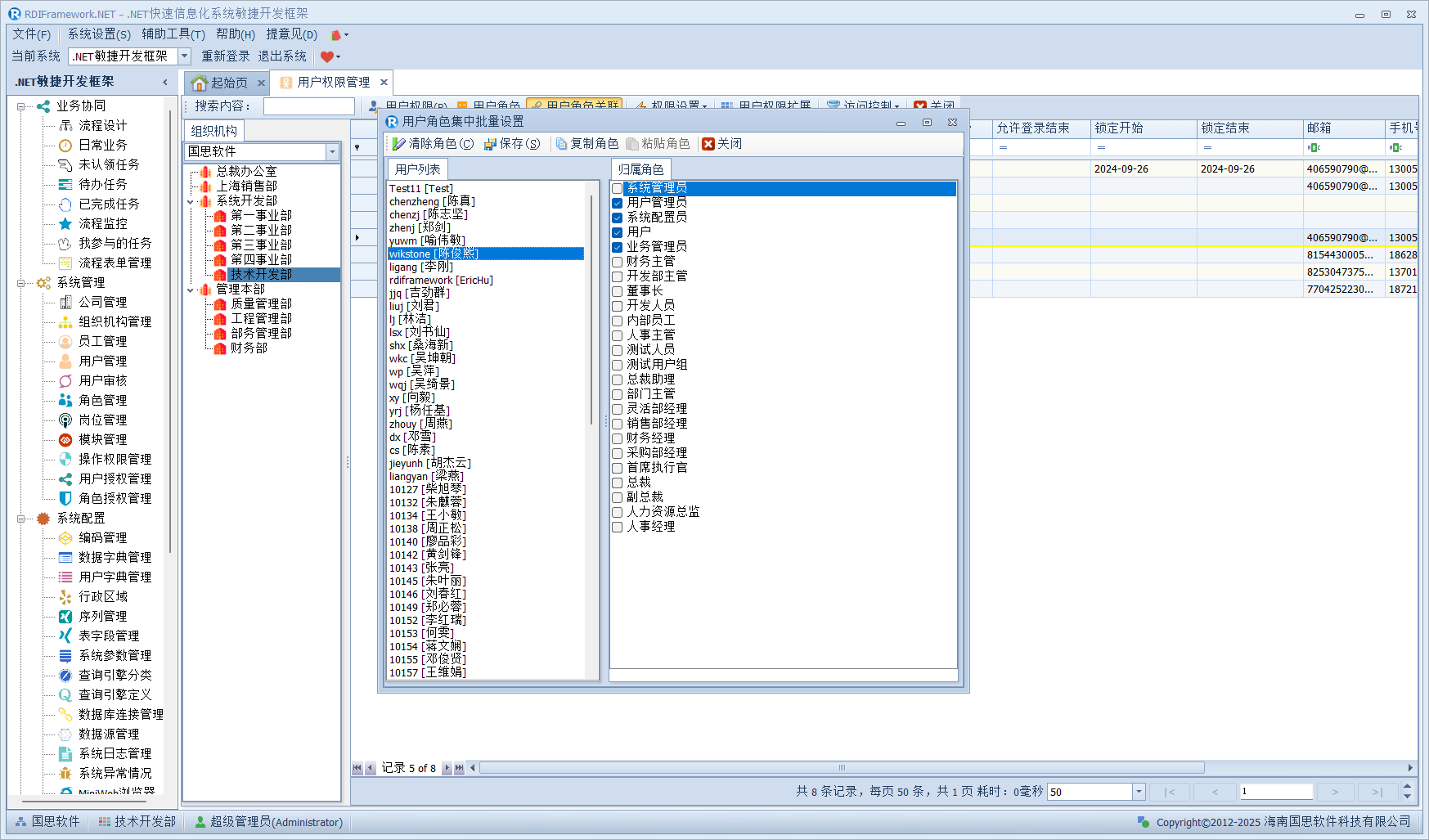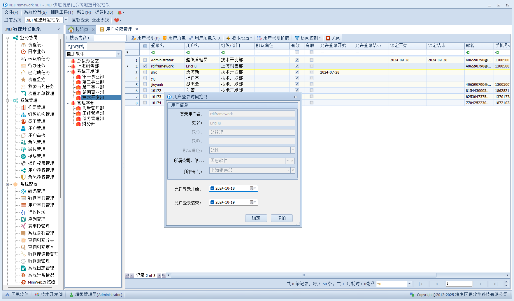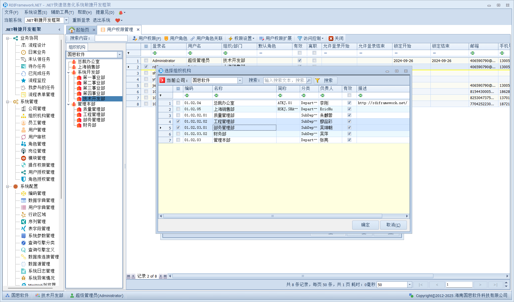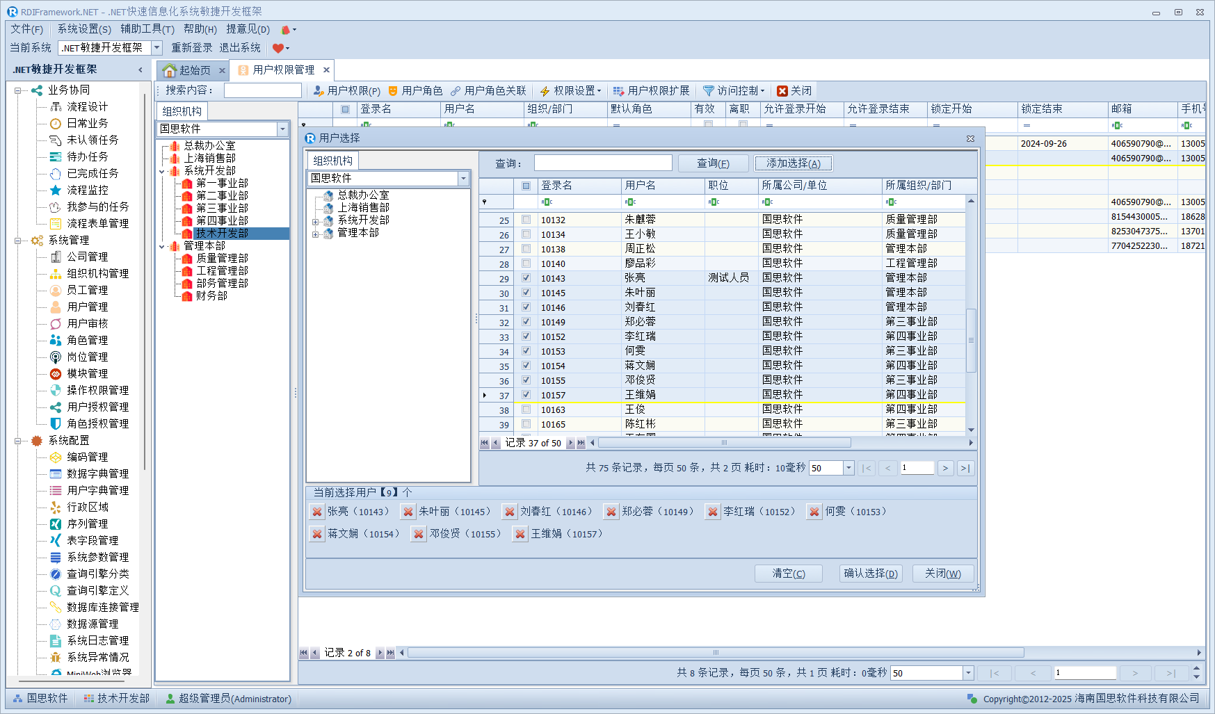 我们进入对应的用户管理或员工职员管理,左侧的组织机构也已经在我们设置的范围内了,如下图所示。
