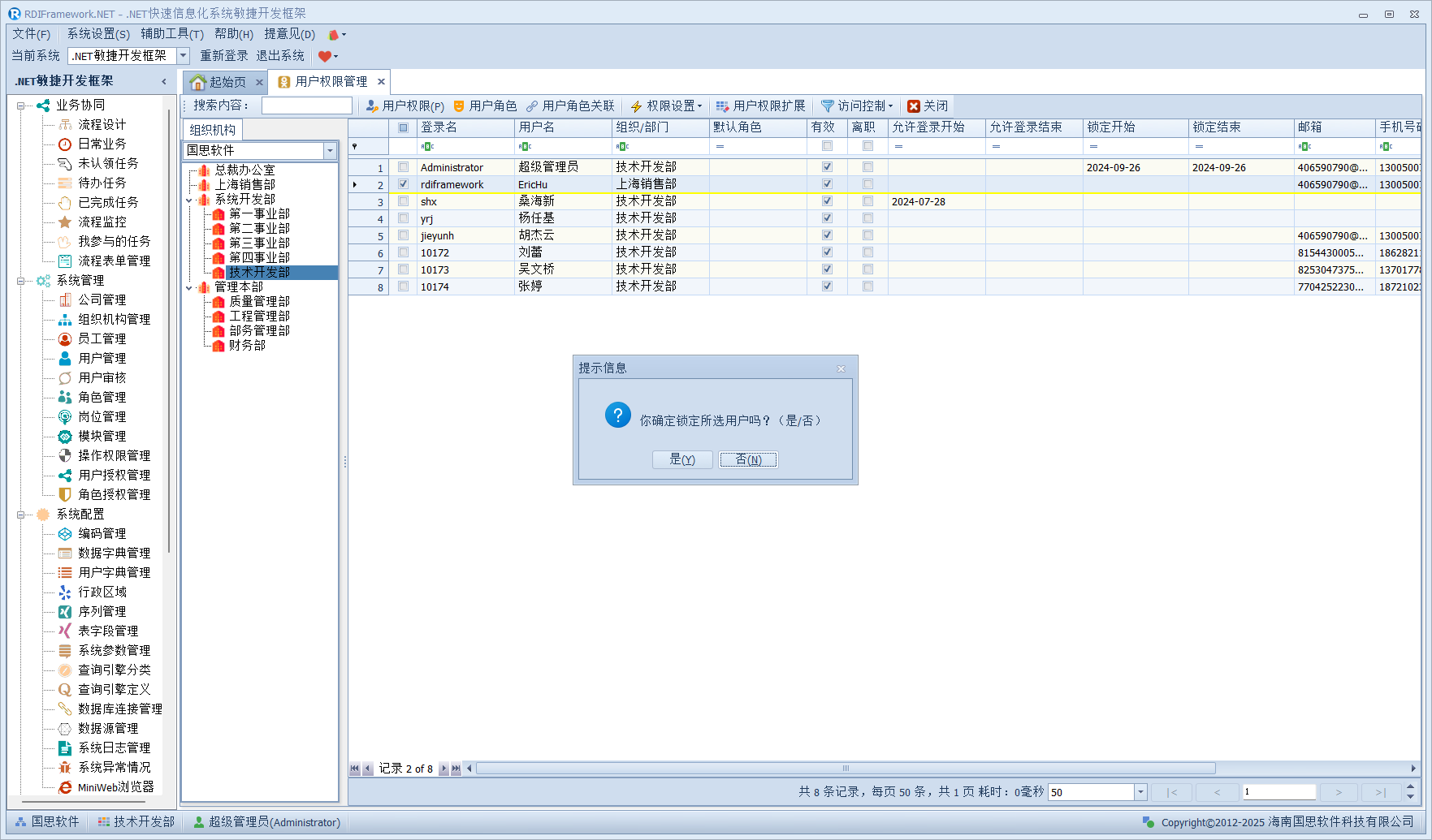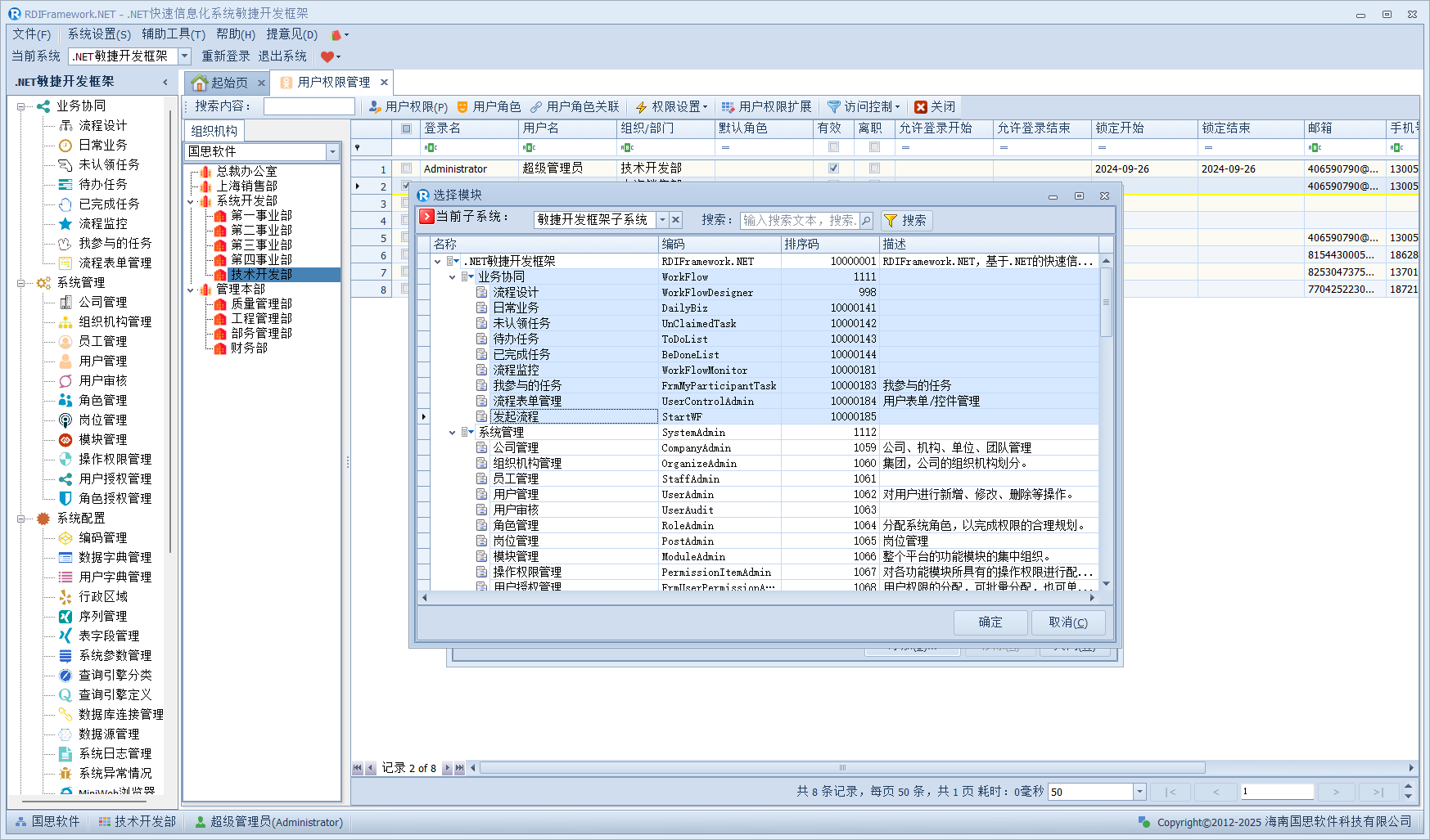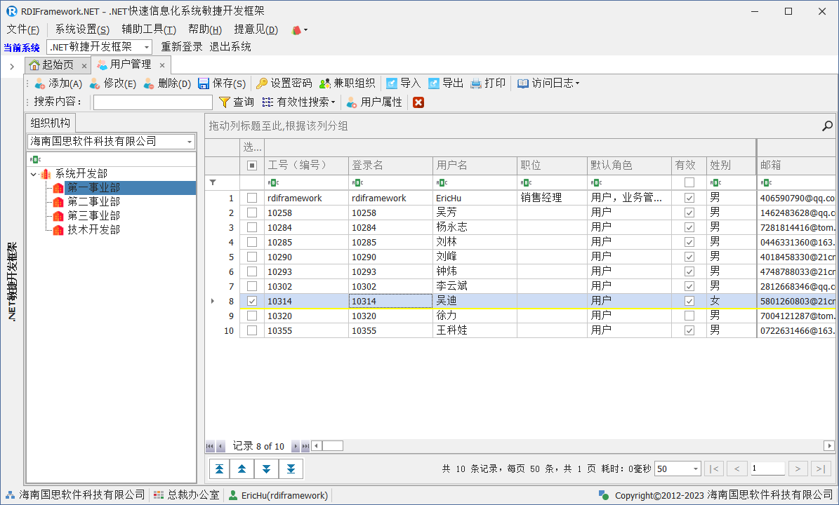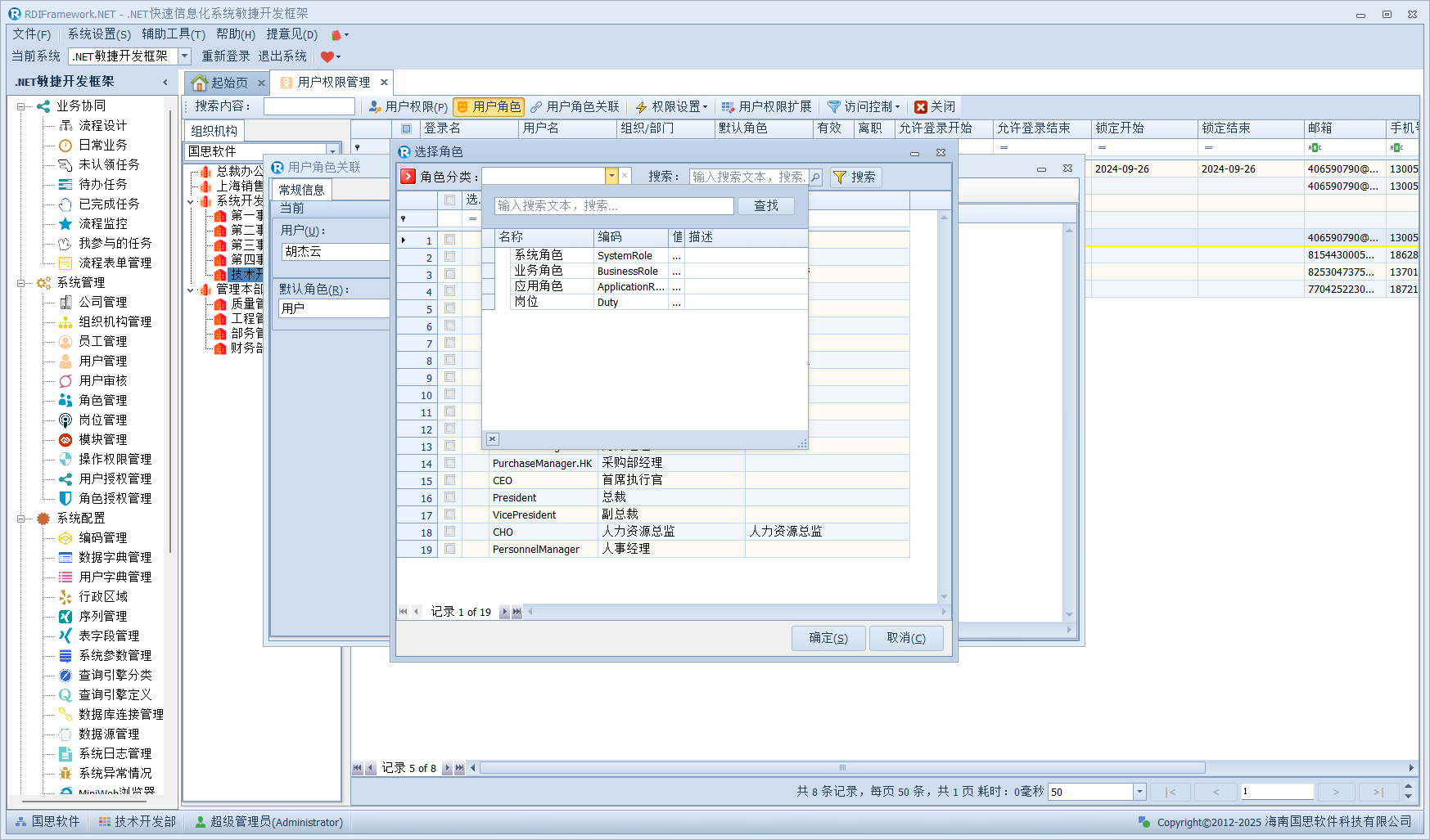 我们进入对应的用户管理或员工职员管理,左侧的组织机构也已经在我们设置的范围内了,如下图所示。