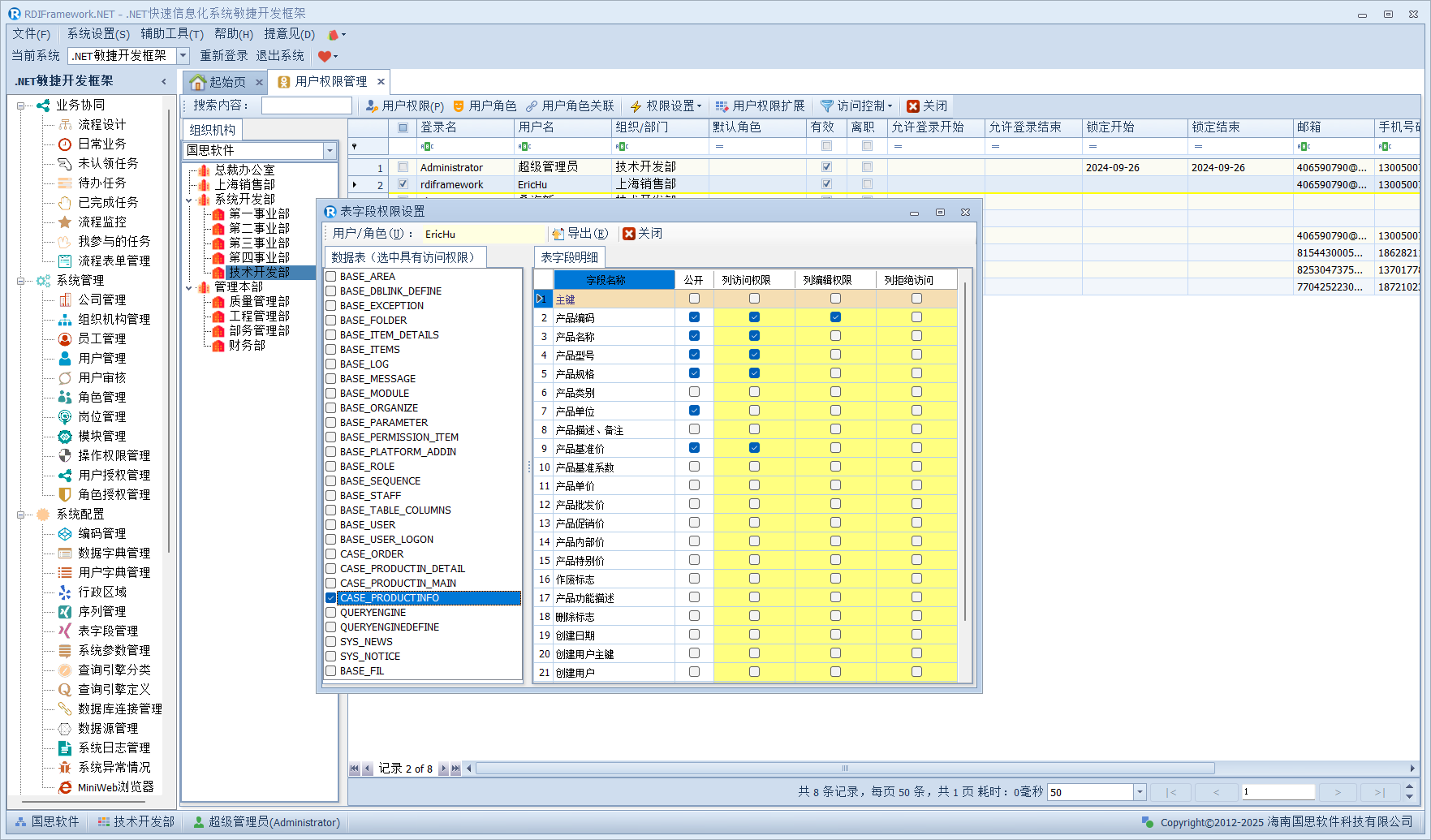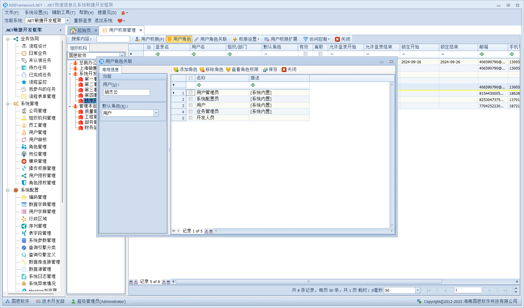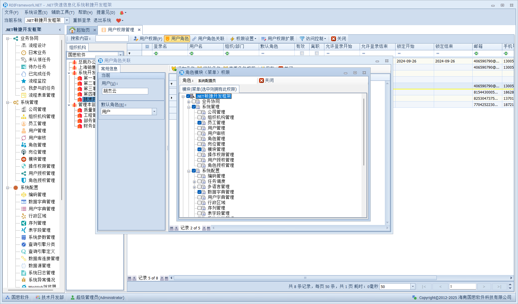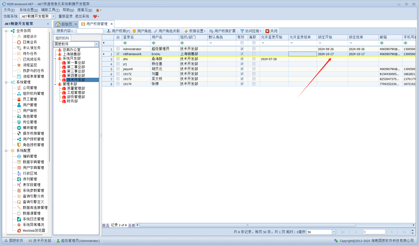 我们进入对应的用户管理或员工职员管理,左侧的组织机构也已经在我们设置的范围内了,如下图所示。