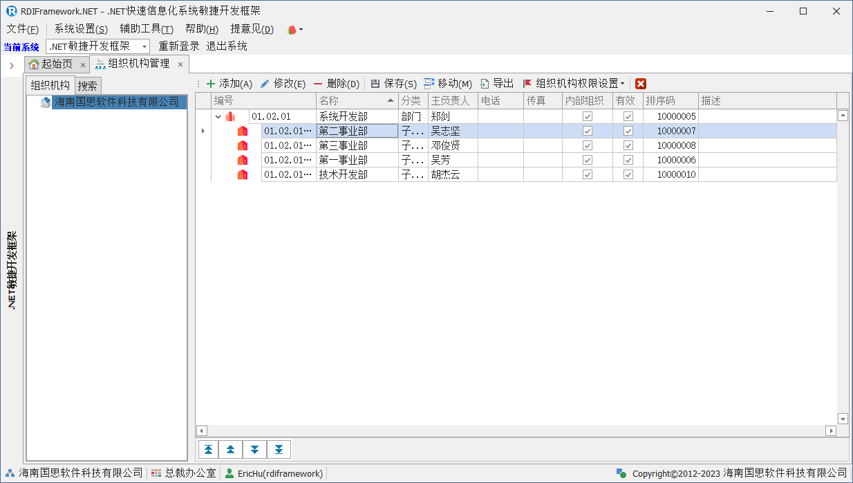 下面我们以"rdiframework"登录框架后打开"组织机构管理"模块,如图 4.11.4-3 查看用户对组织机构授权范围设置的效果。可以看到用户"rdiframework"可以访问的组织机构范围已经控制在了我们限制的范围中了,这样就可以让不同区域的管理者管理自己所在的组织机构而不用展示全部组织机构,做到范围授权。