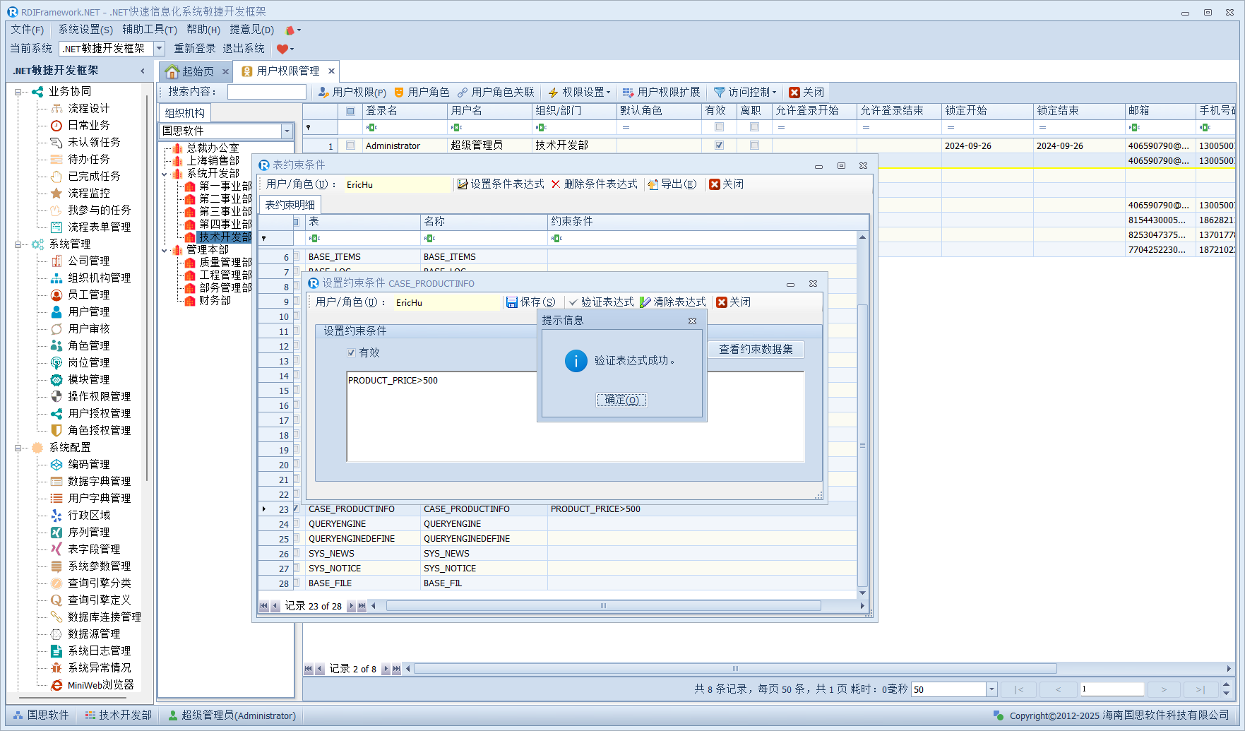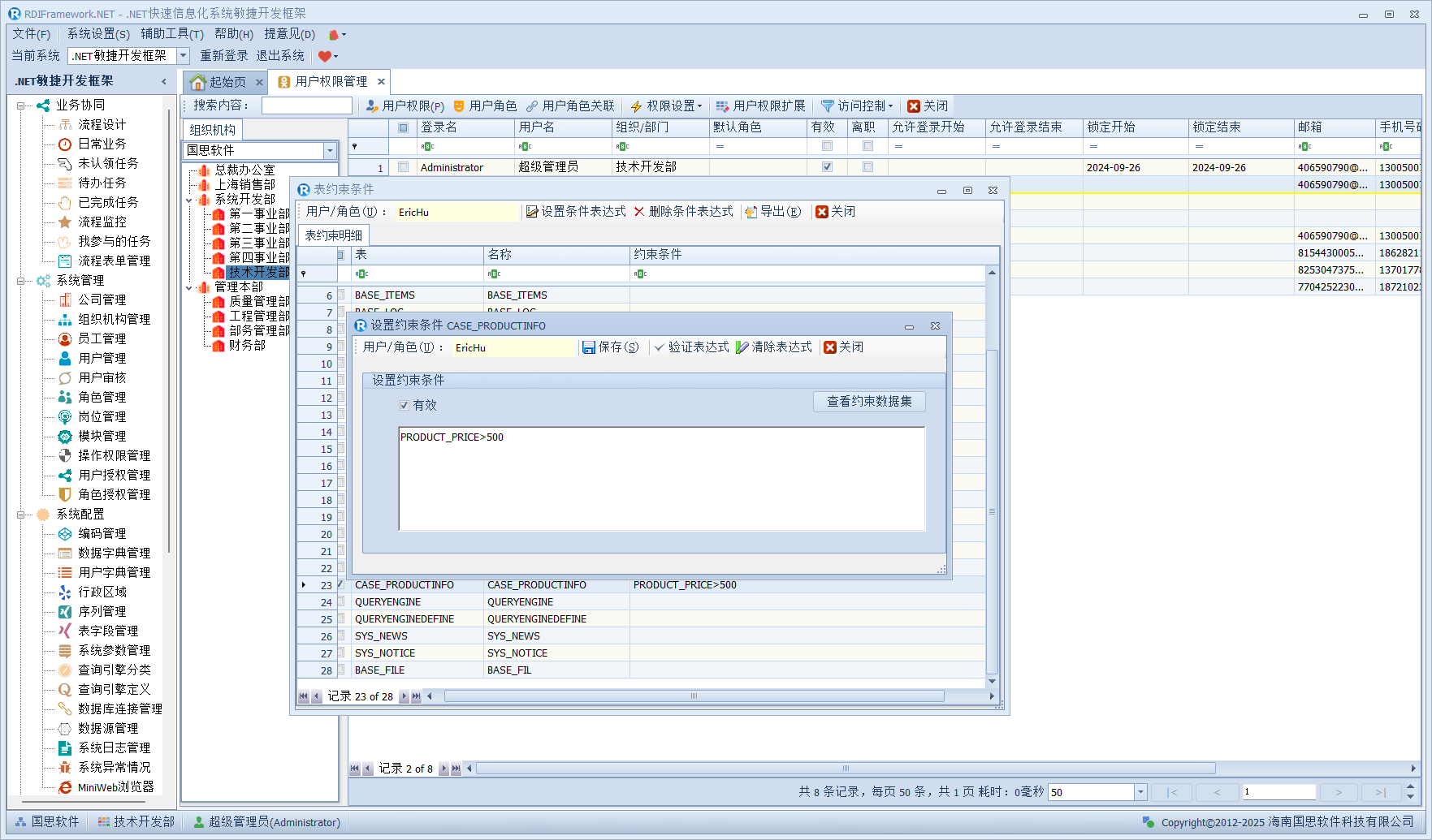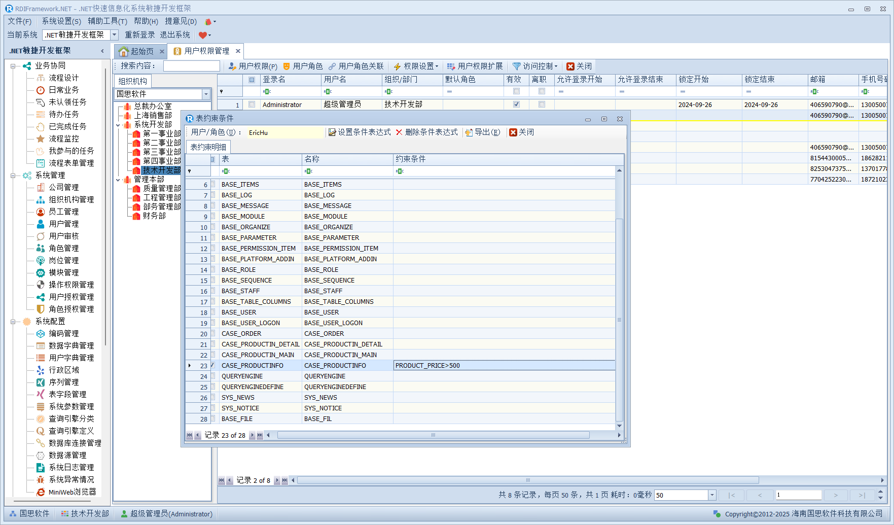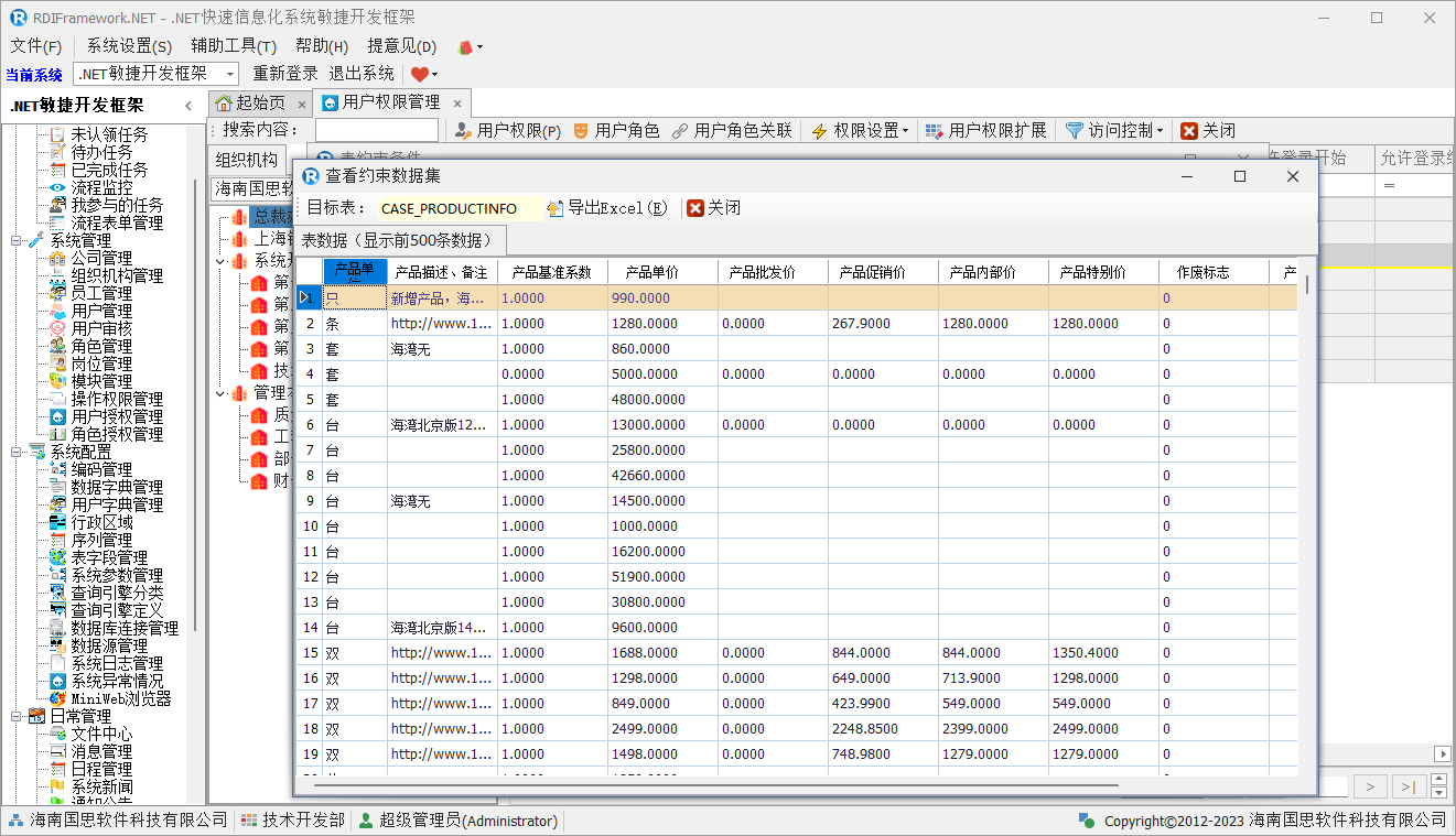 在上图中,我们设置所选用户对数据表"产品表"的约束条件为"PRDUCT_PRICE>500",在开发过程中,通过我们的服务接口来得到这个约束条件表达式,就可以对相应用户进行表数据约束的控制了。