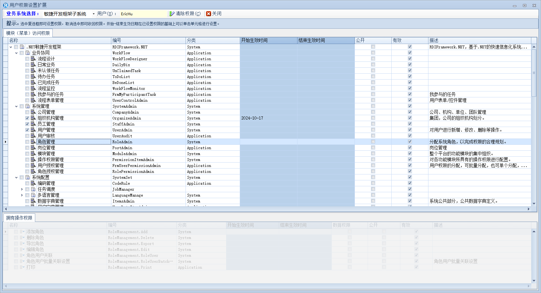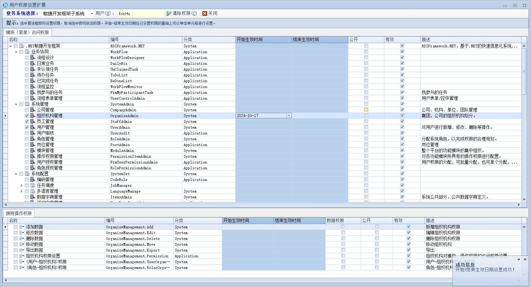 1、模块与操作权限项的访问权限复选框选中即可授予对应的权限,同时可直接在 TreeList 界面单击设置"开始生效时间、结束生效时间",设置后鼠标移走会自动保存所设置。